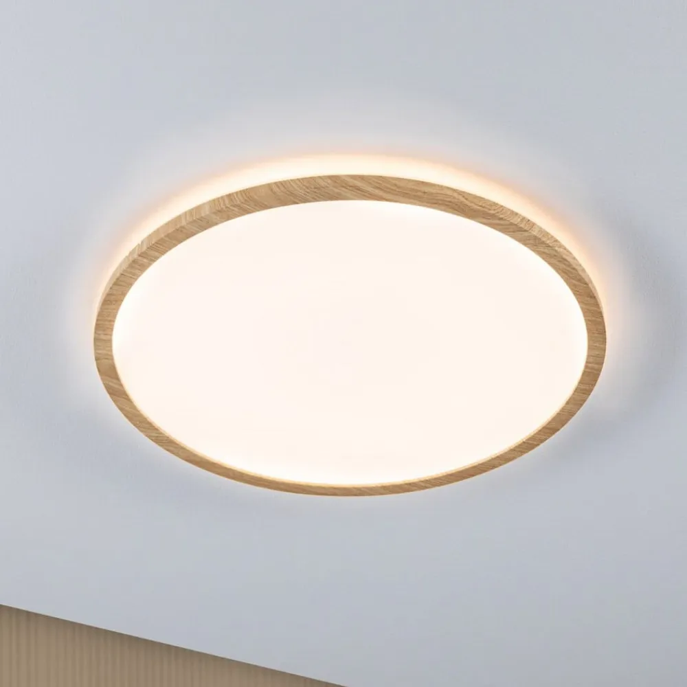 Paulmann LED-loftslampe Atria Shine Ø42cm kombinerer moderne design med et naturligt egetræslook. Den integrerede LED-lyskilde sikrer en jævn belysning i varmhvidt lys (3.000 K), der skaber en behagelig atmosfære. Med en farvegengivelse på 80 Ra gengives farver autentisk og klart, hvilket gør lampen ideel til forskellige boligområder.