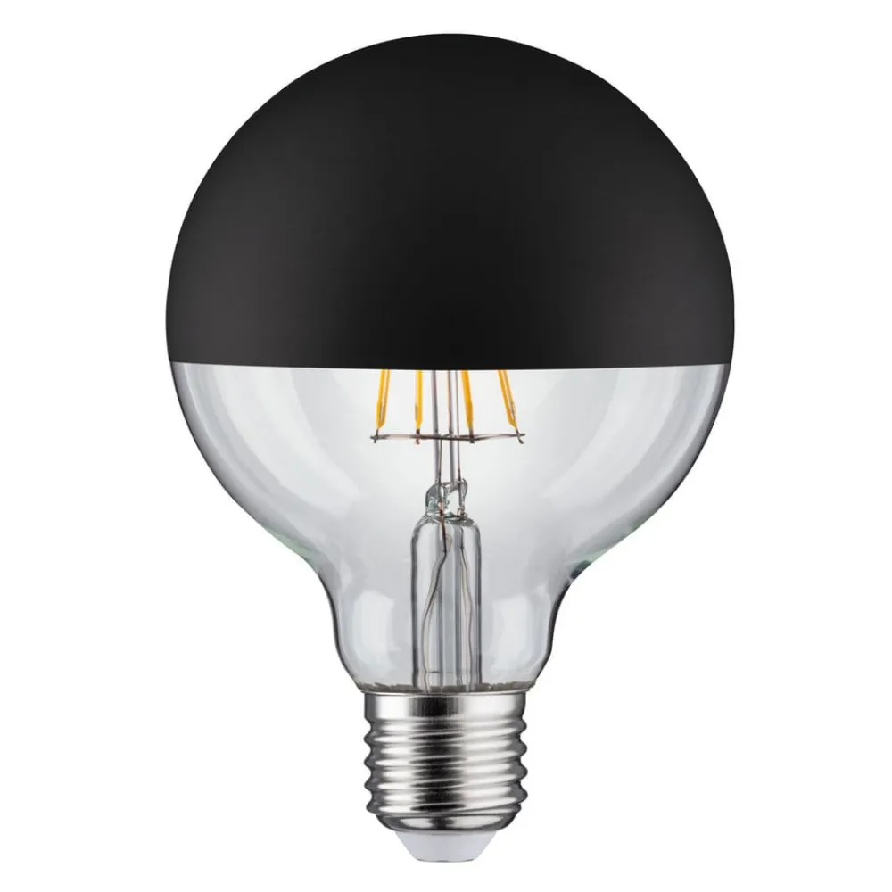 LED-pære E27 G95 Filament 6,5W med spejlvendt hoved Denne LED-pære med spejlvendt hoved er ideel til blændfri belysning i alle armaturer, hvor der er direkte udsyn til lyskilden – varmt lys med 2.700 K i stil med en kulfilament – dæmpbar med mange kommercielt tilgængelige dimmere