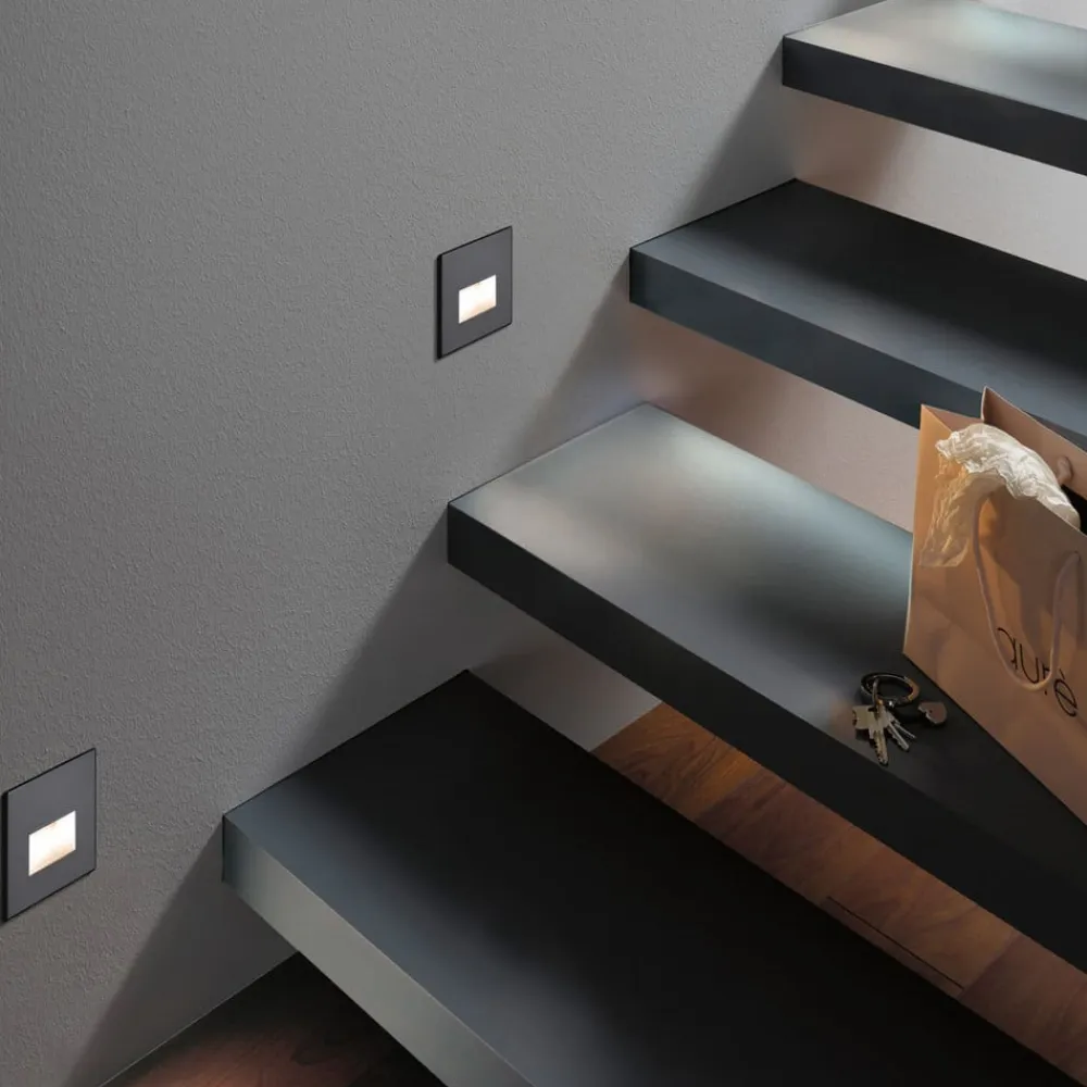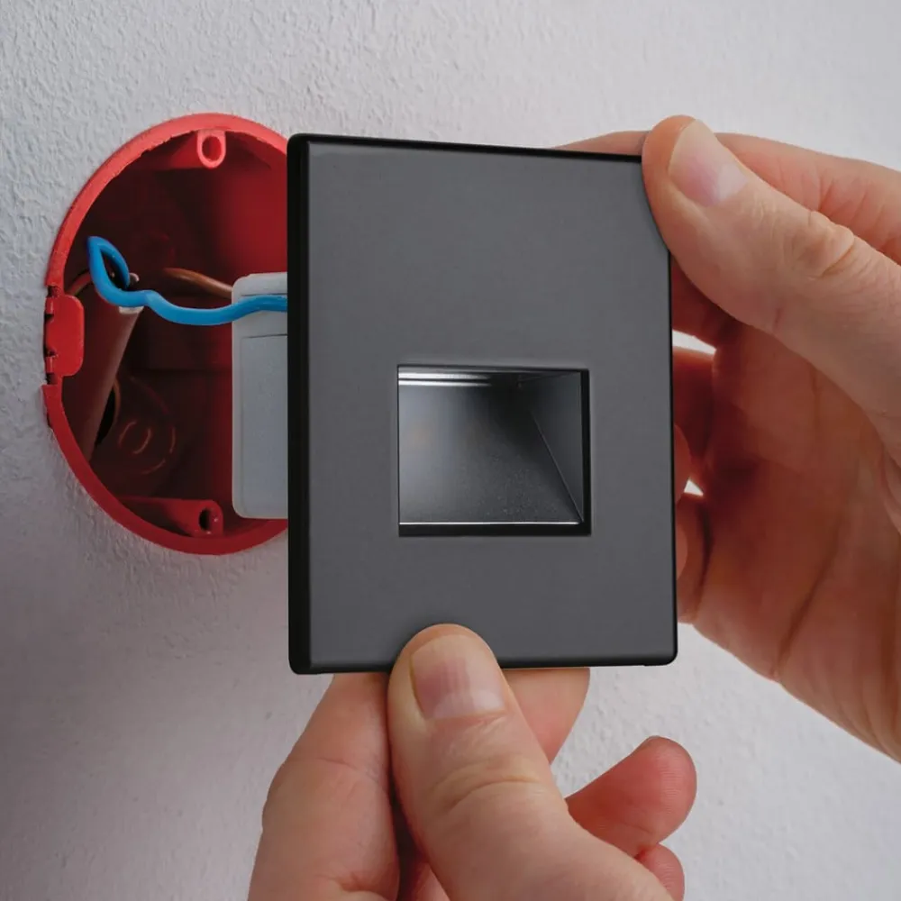 Lyset fra LED’erne i det kvadratiske Edge LED vægindbygningsarmatur stråler nedad gennem den skråt udformede lysudgang, så gangarealer i gangen eller trappeniveauet bliver perfekt og sikkert oplyst. LED-indbygningsarmaturet kan installeres i standard indbygningsdåser med en diameter på 6 cm. Det kan bruges til at skabe smukke lyseffekter, især når flere armaturer installeres i en væg til belysning af trapper eller korridorer.
