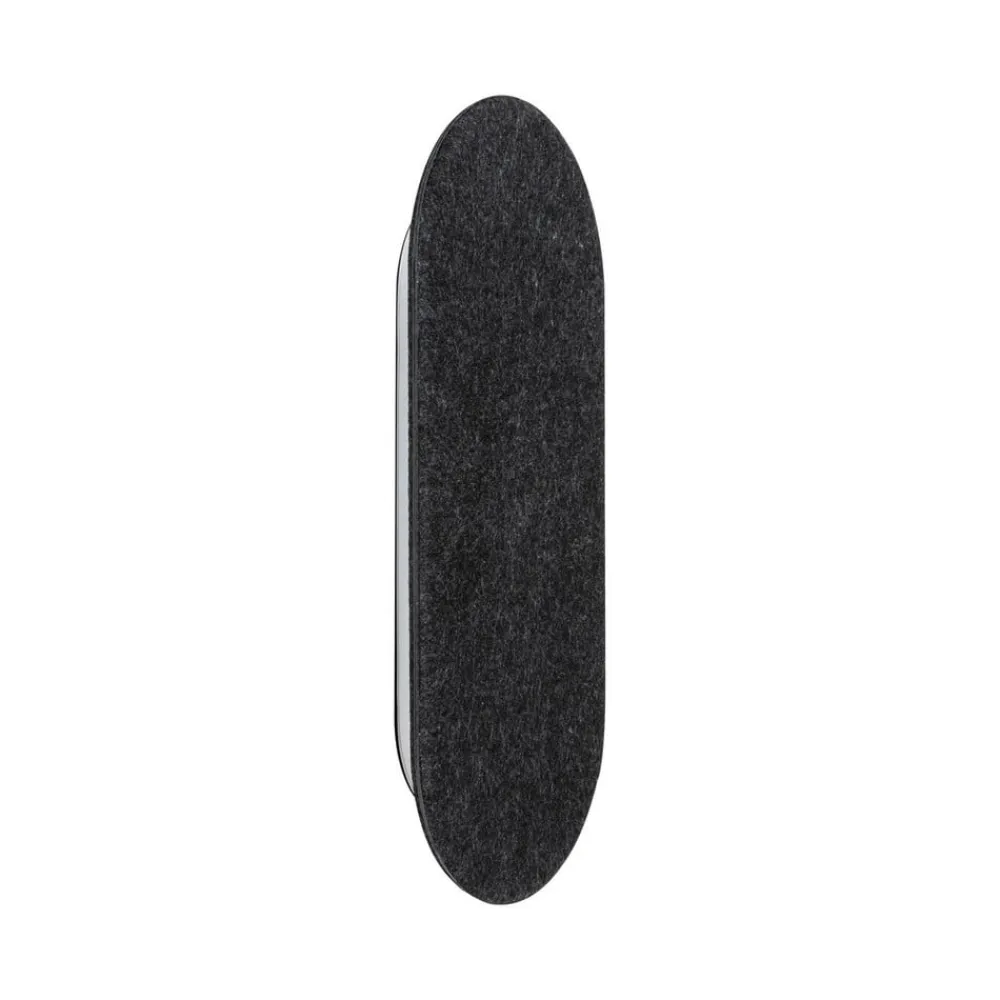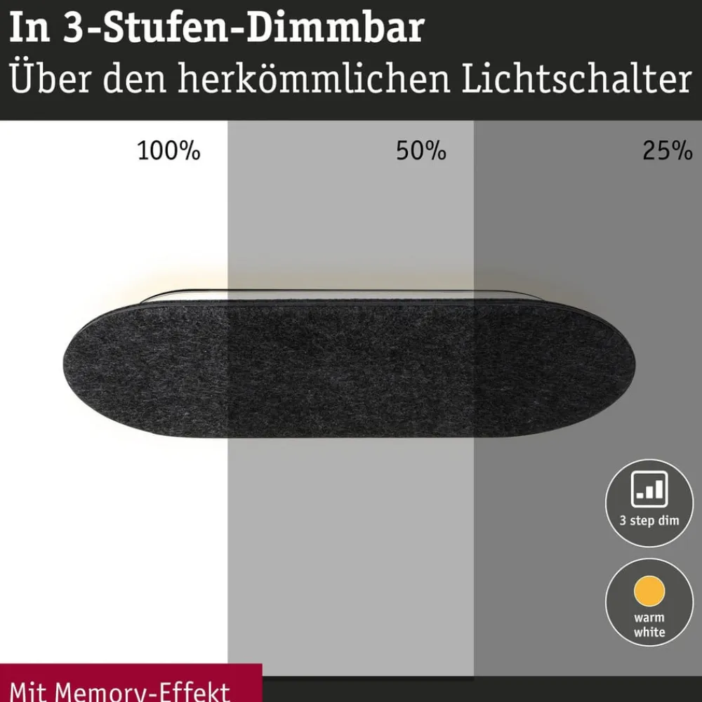 Oval Tulga LED-væglampe med antracitfarvet filtskærm og 3-trins dæmpningsfunktion, indirekte lysfordeling Tulga LED-væglampen kombinerer moderne design med funktionel lysteknologi. Den flade, ovale lampeskærm er lavet af antracitfarvet filt, som består af mindst 60 % genbrugsmateriale. Det varmhvide LED-modul er placeret på bagsiden, så lyset udsendes indirekte og afskærmet fra fronten. Ved hjælp af en almindelig vægkontakt kan lyset dæmpes i tre trin (100 %, 50 %, 25 %) ved at skifte Tulga hurtigt efter hinanden. Det tidligere aktive lysstyrkeniveau er tilgængeligt igen, når lyset tændes igen (hukommelsesfunktion). Filtmaterialet har en lyddæmpende effekt og understøtter dermed en god rumakustik.