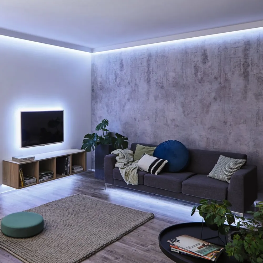 Denne LED-strimmel leveres som et basissæt med en plug-in strømforsyningsenhed, som muliggør en ukompliceret strømforsyning via stikkontakten. Takket være den selvklæbende underside og fleksibiliteten kan strimlen monteres på mange flade og buede overflader – både på møbler, vægge og fodpaneler. Båndet kan også forlænges eller forkortes uden problemer; tilsvarende forlængerbånd fås som tilbehør.