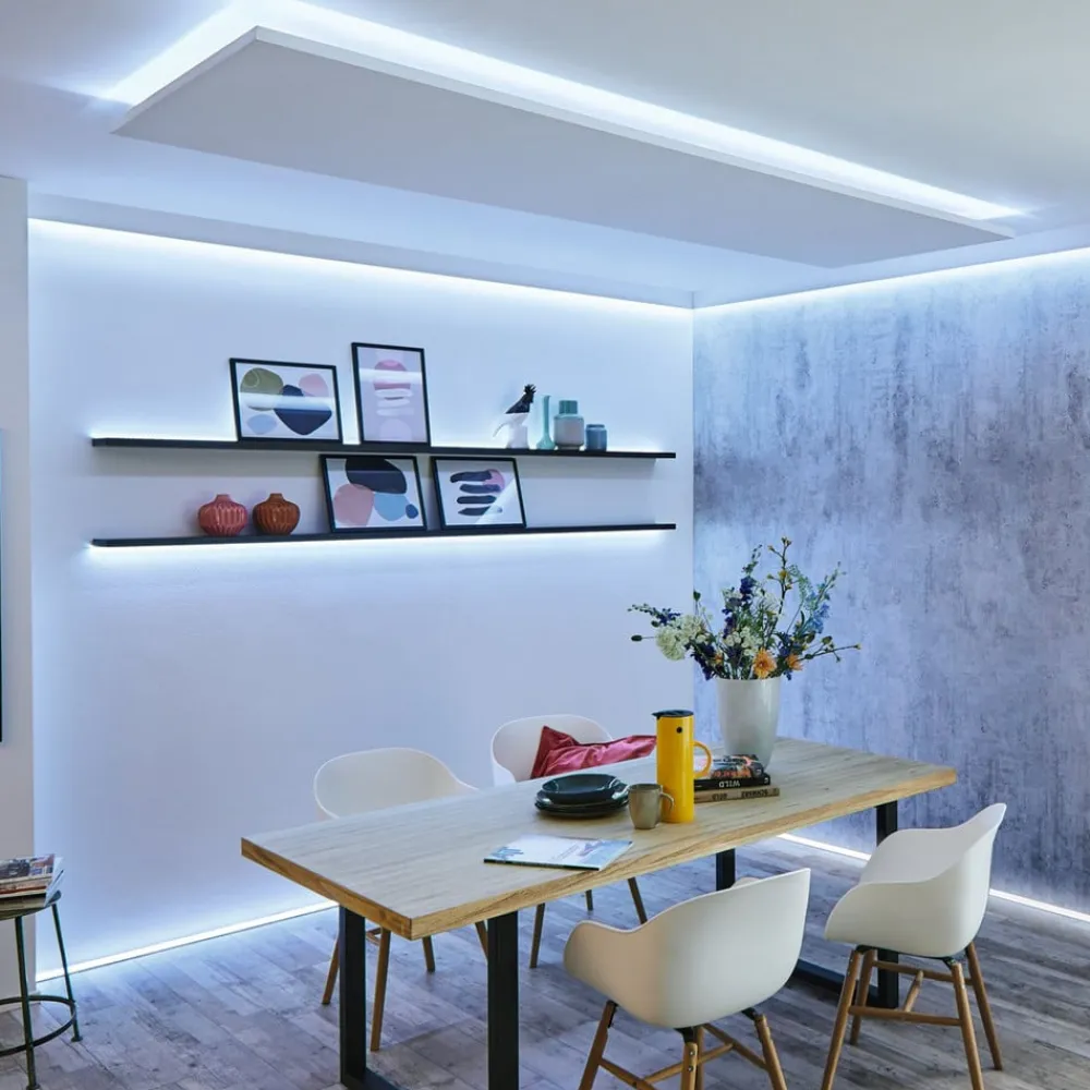 Med denne strimmel kan et eksisterende MaxLED LED-grundsæt udvides og forlænges efter behov. Den selvklæbende underside gør det nemt at montere strimlen, og den kan også afkortes til den ønskede længde.
