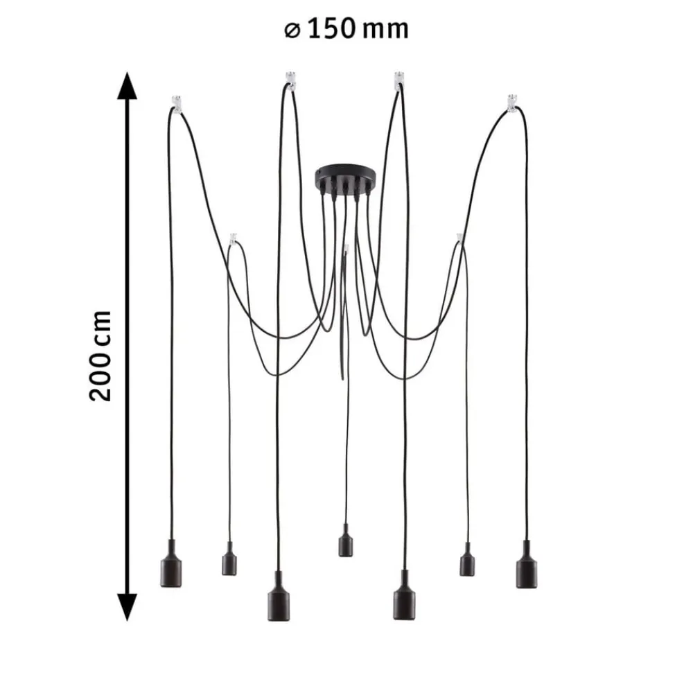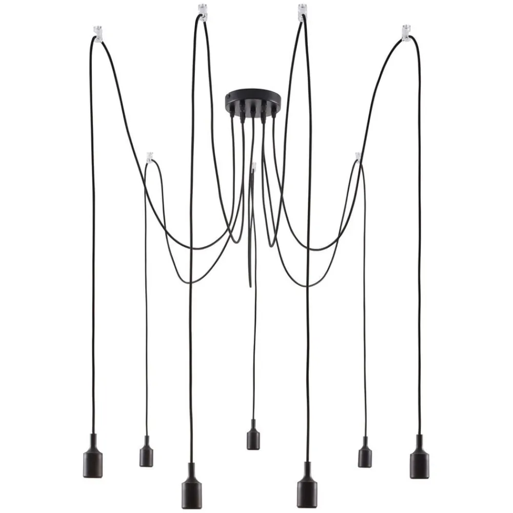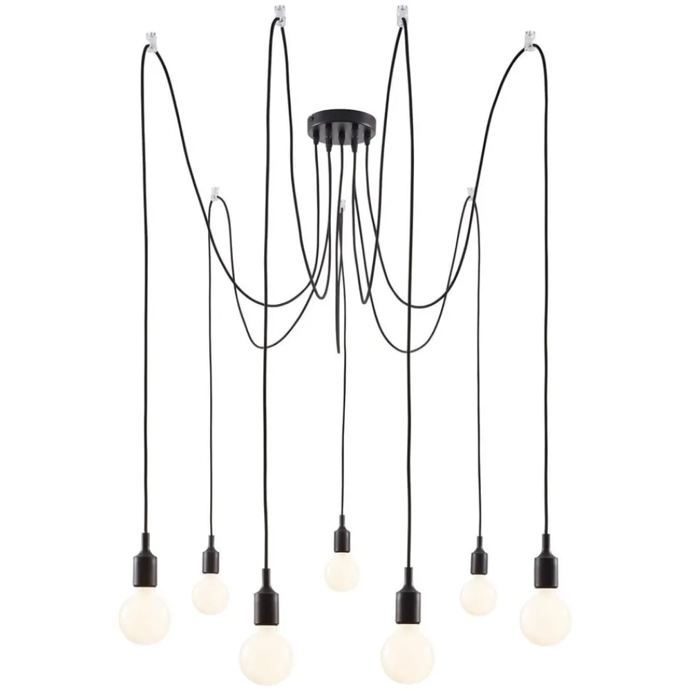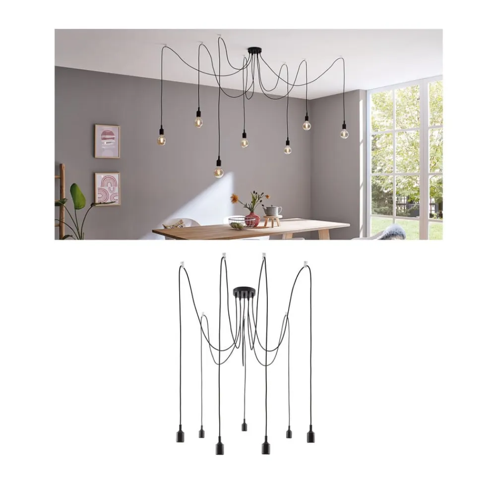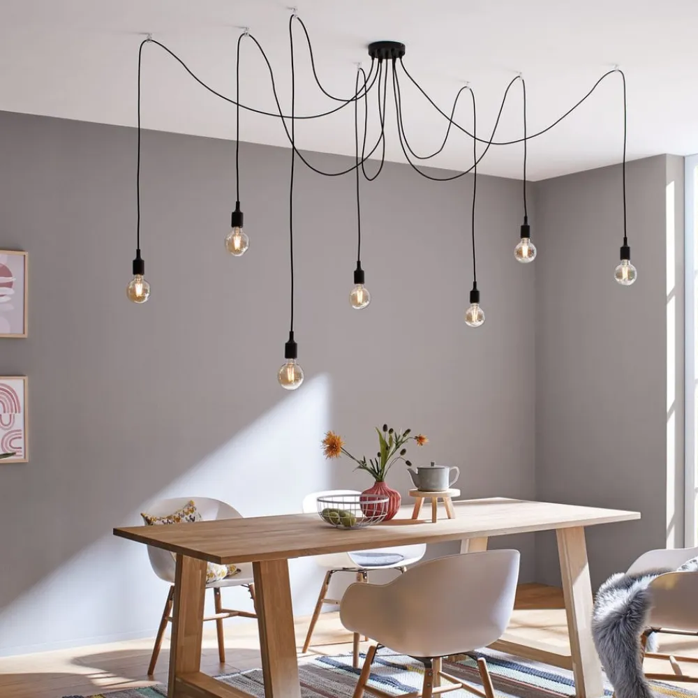 Udstyret med syv lyskilder er Neordic Ketil-ophængslampen i stand til at belyse et stort område. Dette understøttes af suspensionsmulighederne. Den decentrale fastgørelse af de enkelte lyskilder betyder, at de kan placeres i alle retninger, og højden kan også justeres individuelt. På grund af det sorte stofkabel ser pendellampen med flere pendellampe allerede meget elegant ud og tiltrækker opmærksomhed. Denne visuelle stimulus kan tydeligt understøttes af brugen af dekorative lyskilder. Da Ketil har et meget minimalistisk og diskret design og ingen lampeskærme er placeret over stikkene, er lyskilderne direkte synlige. Hovedspejllamper og glødelamper fås i mange forskellige farver, hvad enten det er i guld, sort eller kobber, udvalget er stort, og effekten af pendlen kan påvirkes med hver lampe.