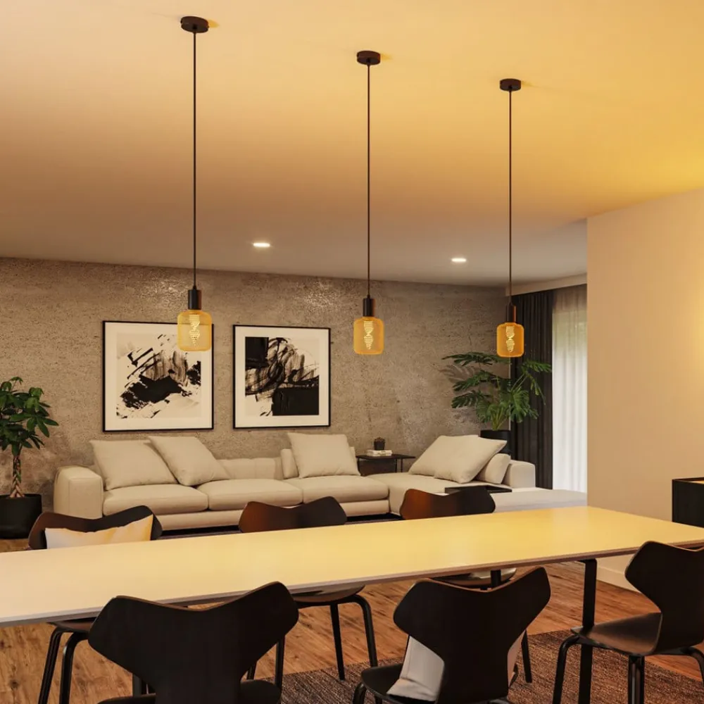 Ravi pendel med E27-fatning, uden skærm Ravi pendlen består af en rund baldakin, et tekstilbelagt kabel og en cylindrisk E27-fatning. En lyskilde på op til 60 W kan skrues i denne fatning. Armaturets udseende kan ændres afhængigt af valget af lyskilde. Billederne viser armaturet med lyskilder fra bl.a. Paulmanns Metallic Glow-serie. Disse er ikke inkluderet i leveringsomfanget, men kan bestilles direkte. Som en enkelt lampe, men også monteret i en række eller i en klynge af flere lamper, oplyser lampen borde eller diske i køkken og stue og er også velegnet til brug i badeværelset takket være IP44-beskyttelsesgraden.