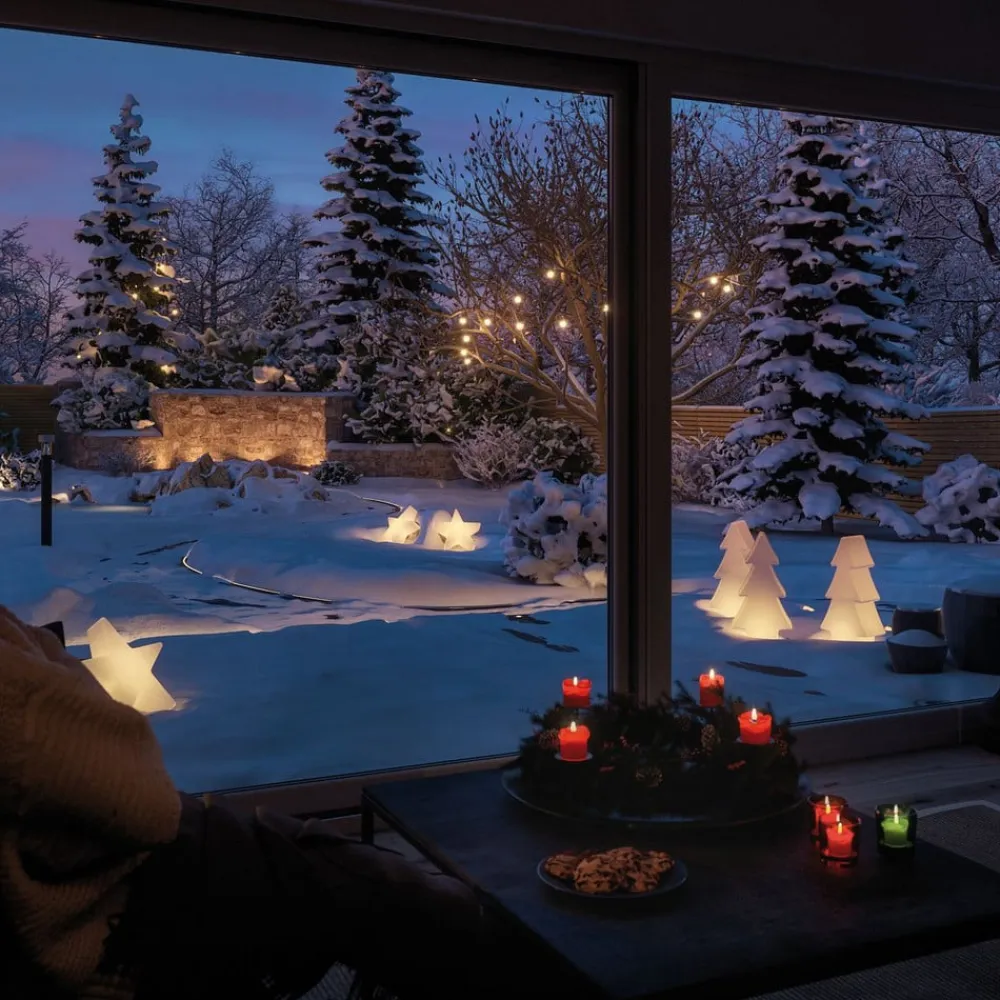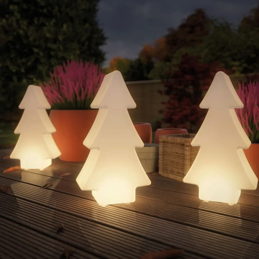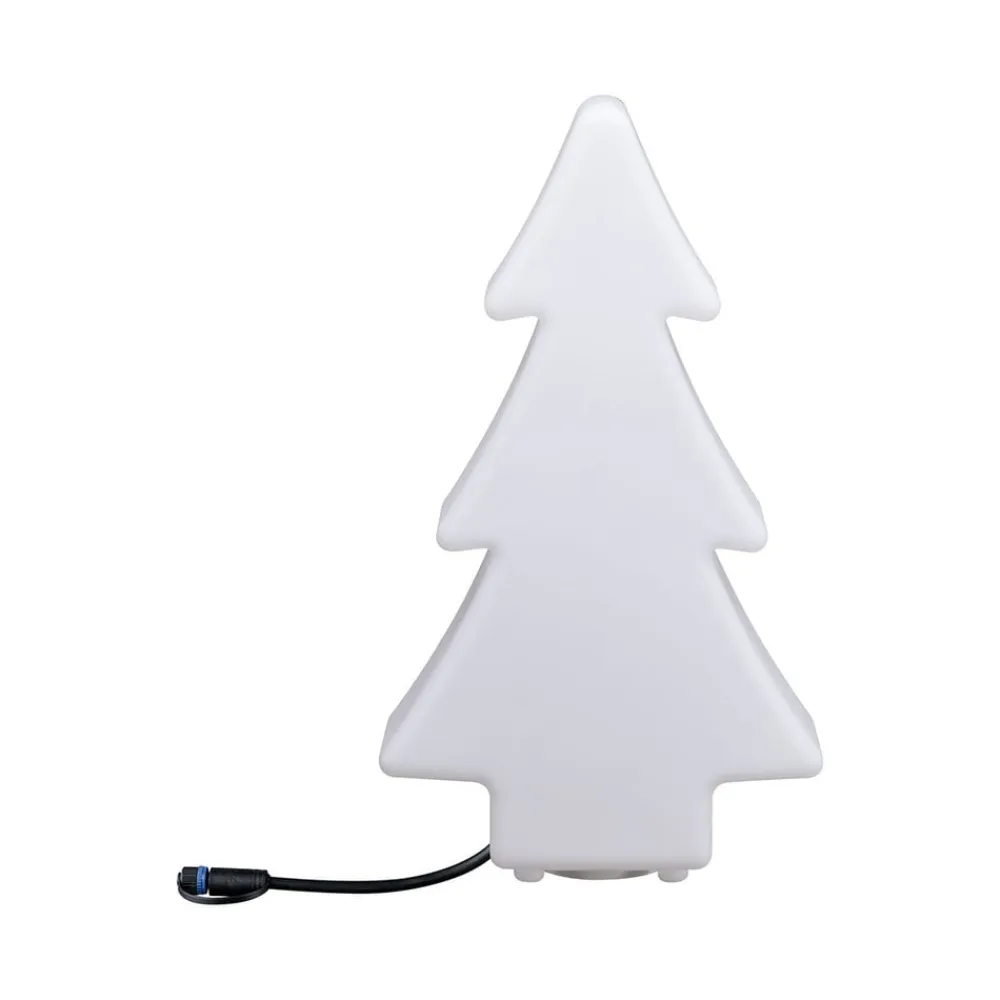 Træformet Plug & Shine dekorationslampe Tree Plug & Shine dekorationslampe Tree er – som navnet antyder – modelleret efter silhuetten af et træ. Det er lavet af hvid, gennemskinnelig plast. Træfiguren lyser jævnt under drift og fungerer som en stemningsfuld accent om natten, der dekorativt supplerer haven (jordspyd medfølger) eller terrassen efter ønske – Med en driftsspænding på 24 V og vandbeskyttede kabler, tilslutninger og lys er Plug & Shine fra Paulmann en alsidig og sikker belysningsløsning til udendørsarealer.