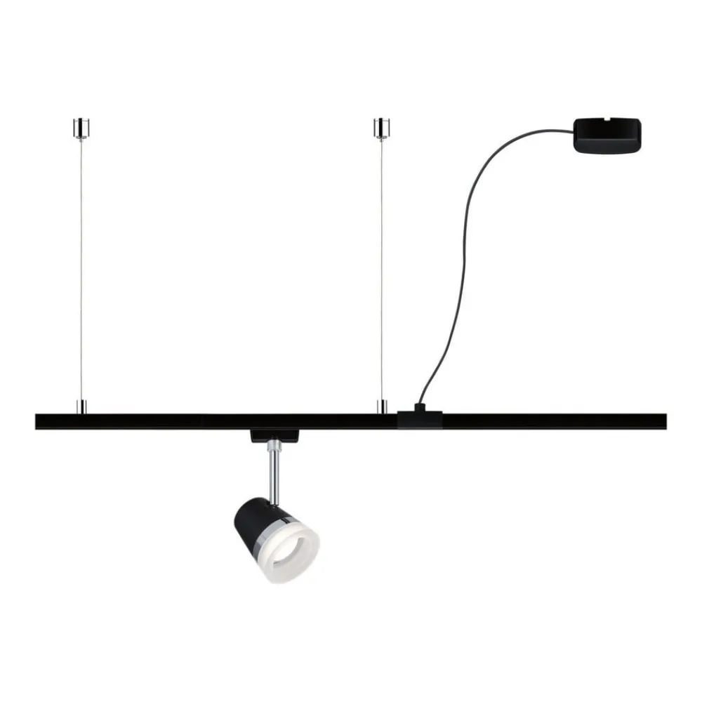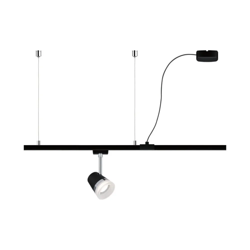 Denne URail mellem-/endetilkobling til strømskinner ophængt på kabel leveres inklusive en endekappe, der er nødvendig, hvis strømskinnen kun lægges i én retning. Kablet kan afkortes ved baldakinen