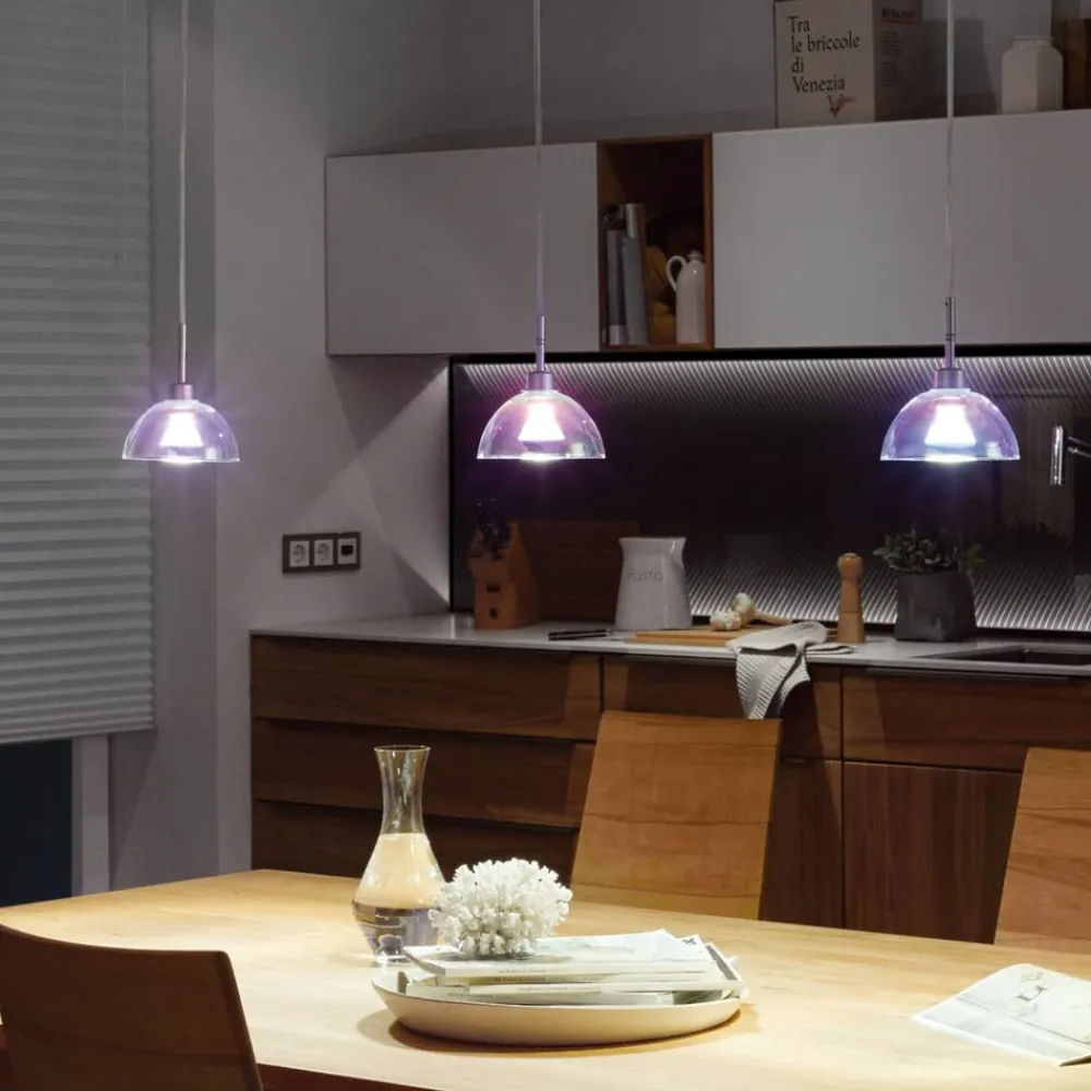 Sarrasani-pendel til URail-skinnesystemet med dikroisk skærm Sarrasani-pendlen til integration i et URail-skinnesystem er det ideelle valg, når det handler om at belyse bordområder eller spiseborde. Pendlens dikroiske glasskærm gør den til et blikfang i systemet, da den transparente glasskærm changerer i mange forskellige farver afhængigt af betragtningsvinklen. Pendlen er udstyret med en E14-fatning. Kablet kan afkortes under installationen, så ophænget kan tilpasses den tilsigtede brug.