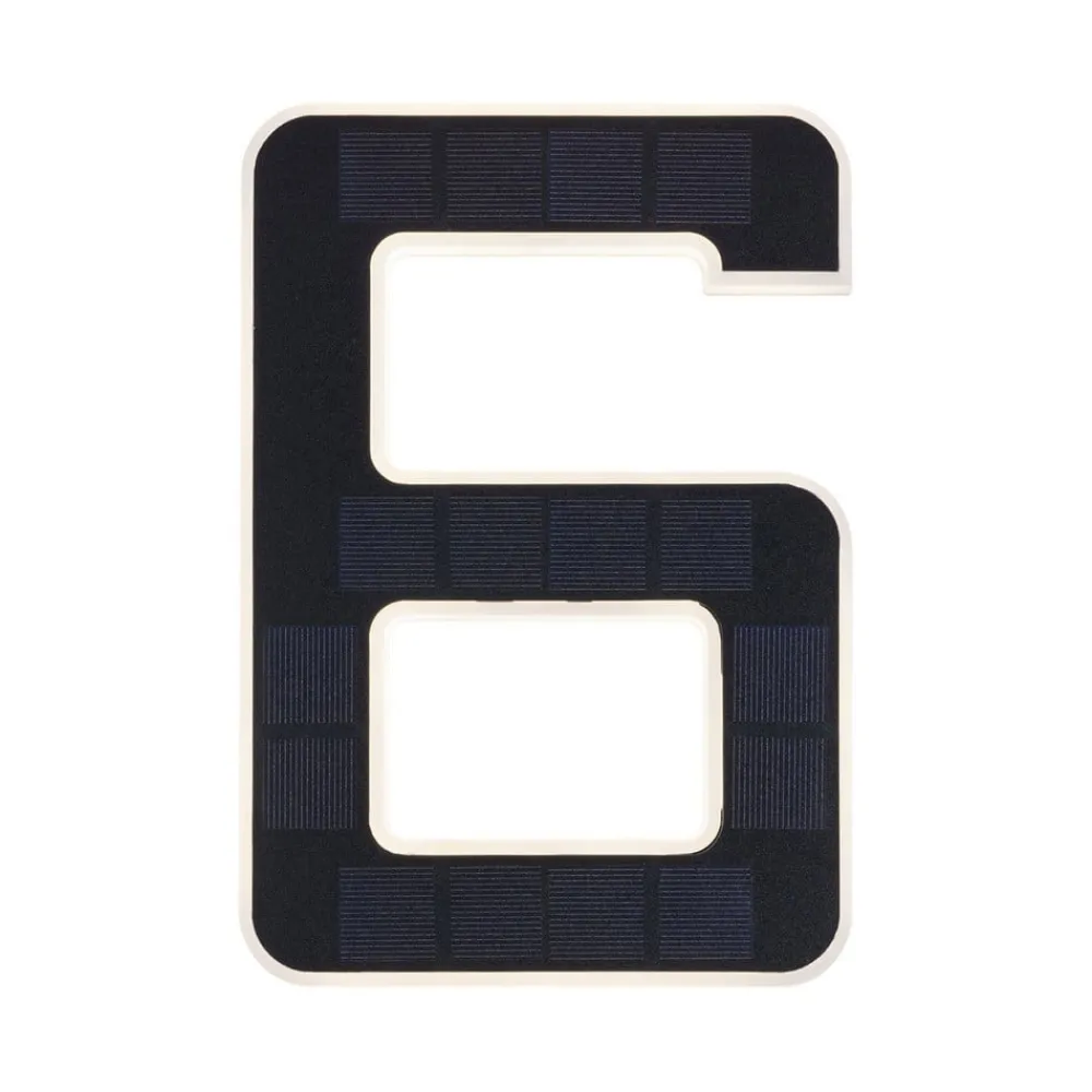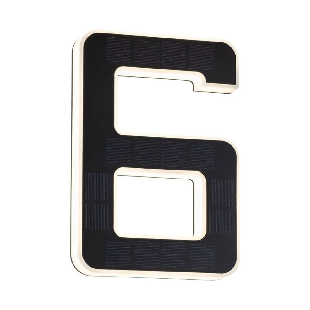 Udendørs solar-husnummer i sort med varmhvid belysning Solar-husnummeret er udstyret med et usynligt integreret solcellemodul, som oplader det integrerede, udskiftelige batteri i løbet af dagen, så det oplyste husnummer kan monteres på facaden, husmuren eller et andet sted helt uafhængigt af en strømtilslutning. Så snart det bliver mørkt, oplyses husnummeret indirekte af de integrerede, varmhvide LED’er. Lyset skinner sidelæns gennem nummerets satinerede ramme – Maks. belysningstid med fuldt batteri 8 timer – Batteriopladningstid 12 timer – Batteri 1 x AAA 1,5V (micro), medfølger