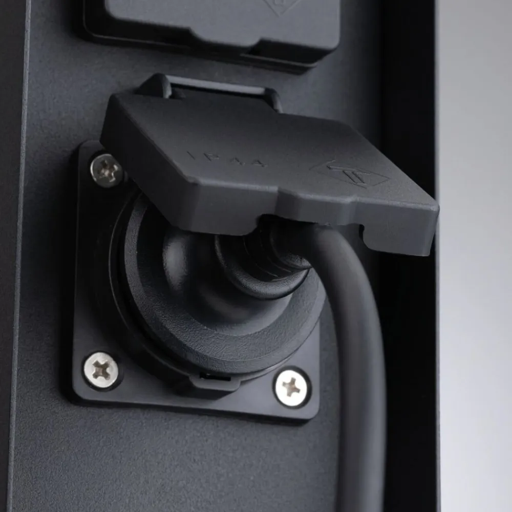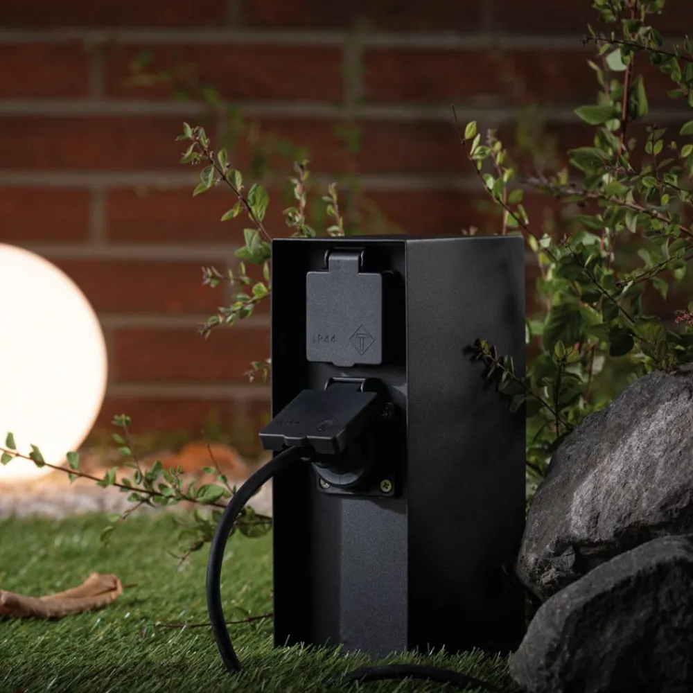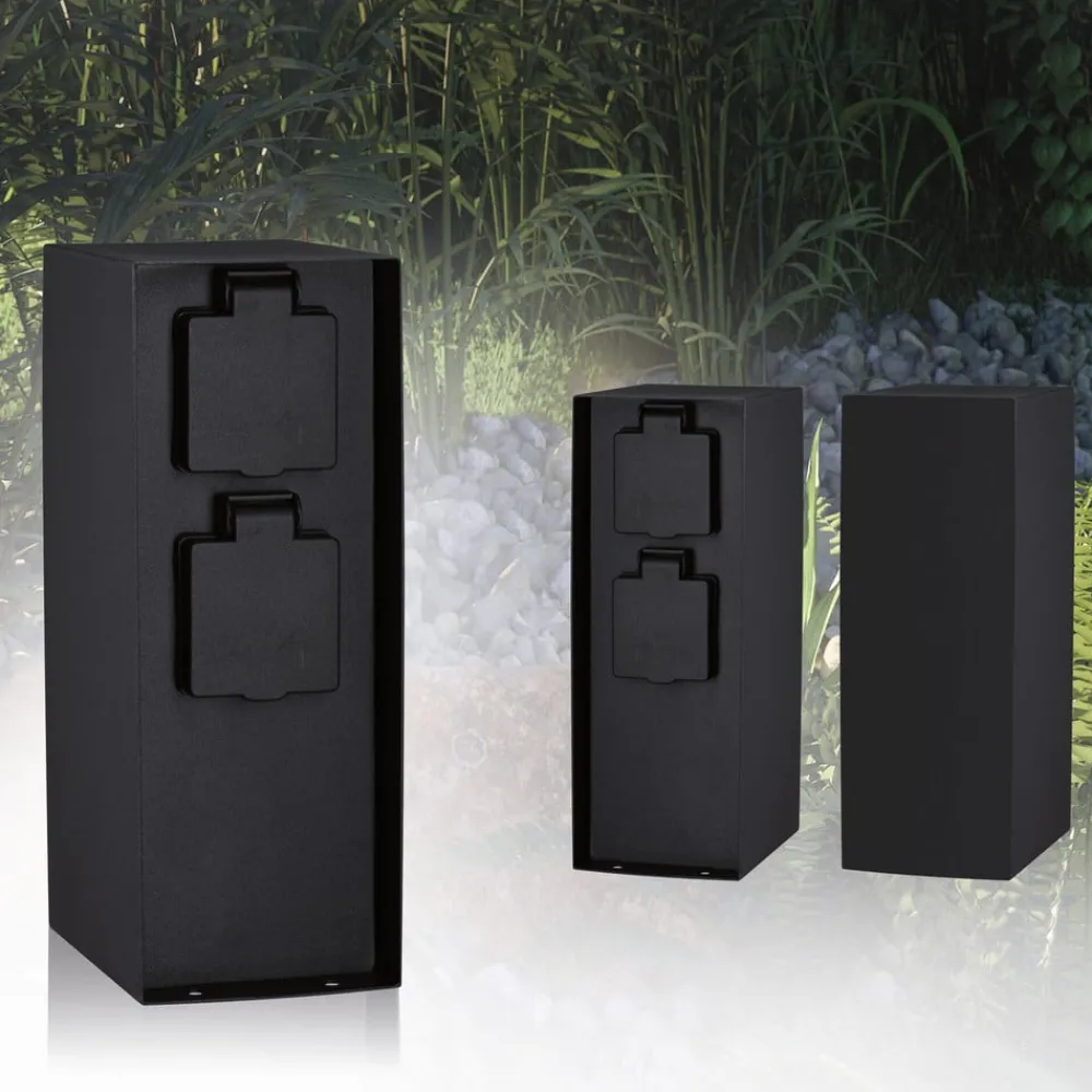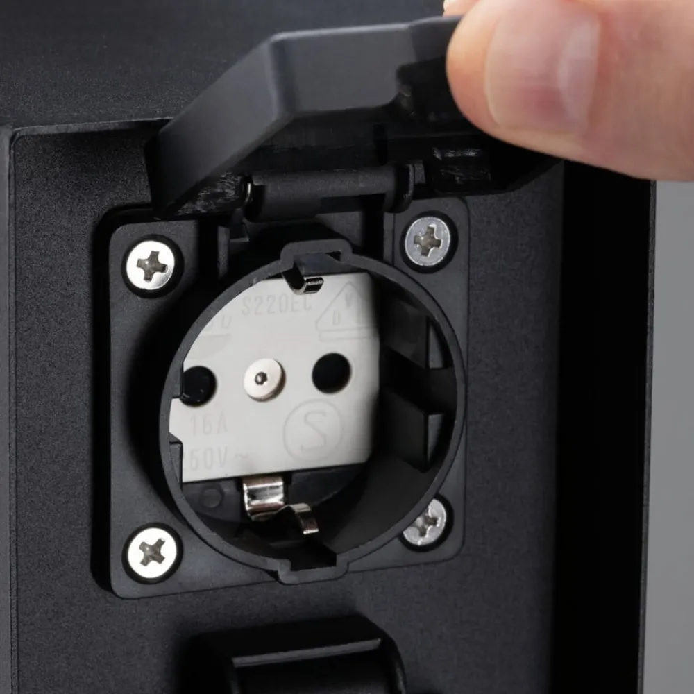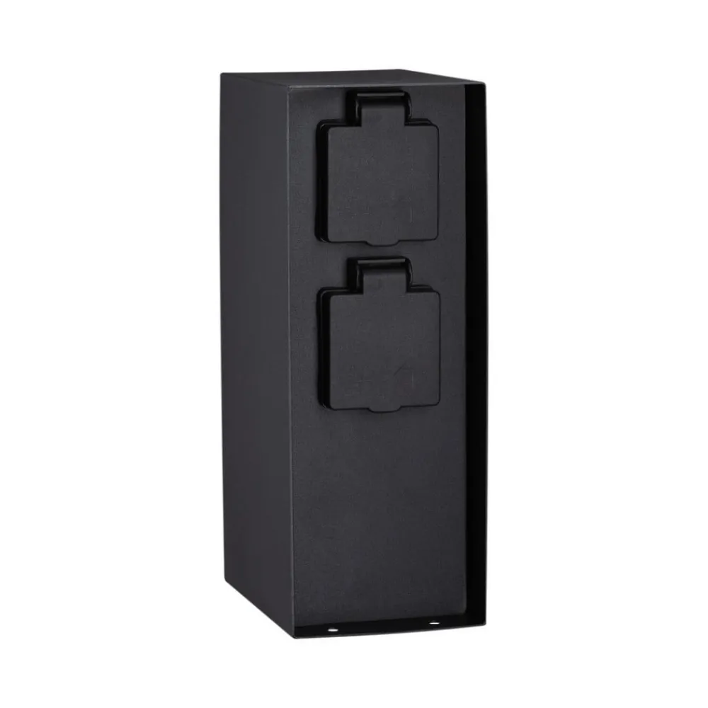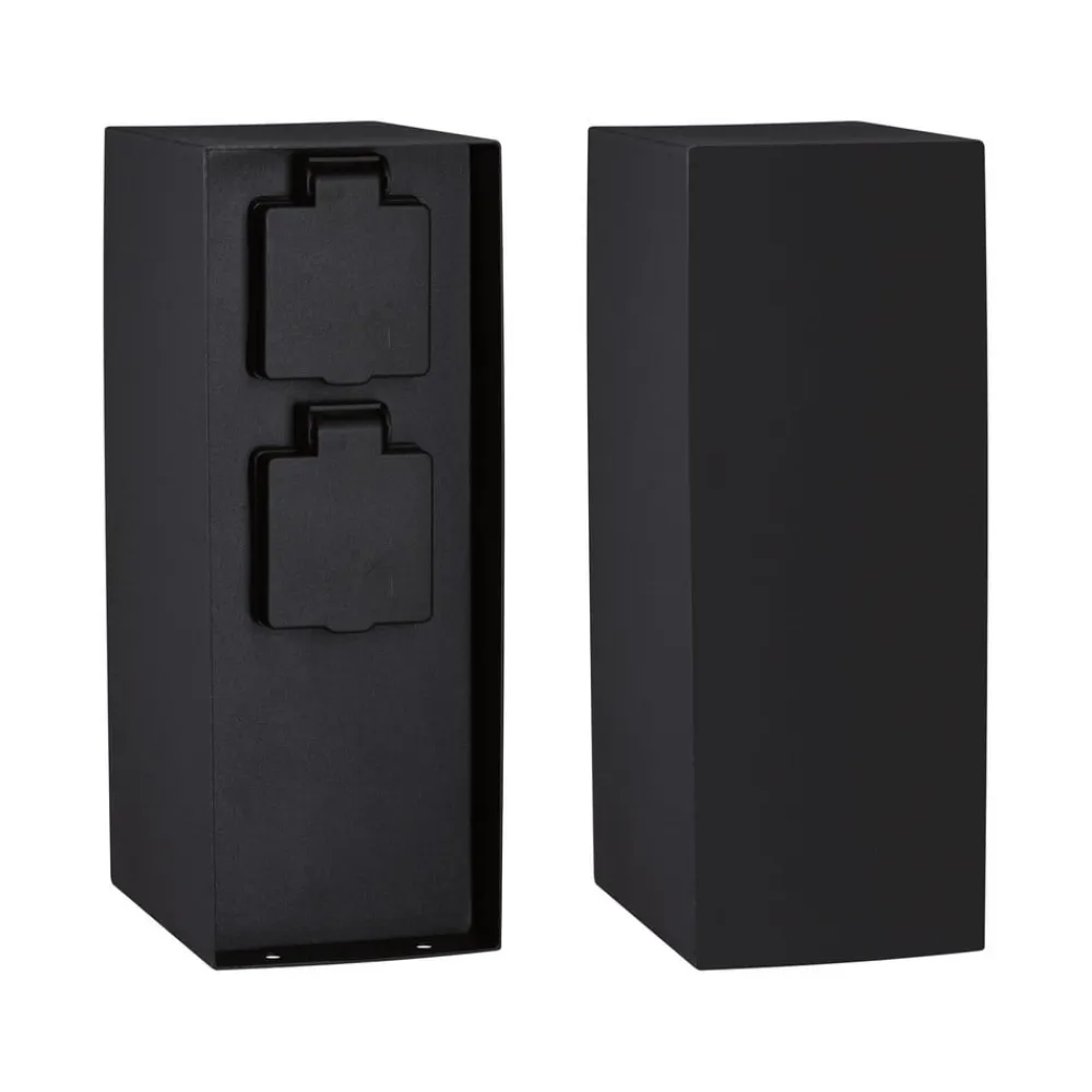 Stikkontaktkolonnen Rio er fremstillet af anthracitfarvet belagt metal og har to Schuko-stikkontakter til tilslutning af elektriske apparater eller lamper udendørs.