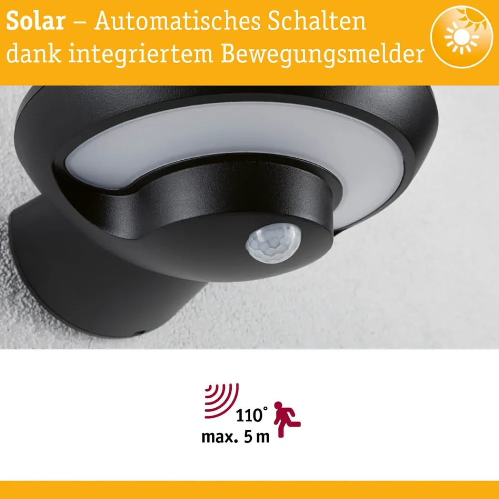 Bordola udendørs LED-væglampe med sensorstyring, genopladeligt batteri og solcellemodul Som selvstændig lyskilde er Bordola LED-væglampen et særligt praktisk valg til udendørs områder. Det sorte plasthus rummer en nedadvendt, U-formet lysudstråling, hvorigennem det varmhvide lys spredes og udsendes bredt. Den tændes automatisk af en skumrings- og bevægelsessensor. Derudover kræves der ingen ekstern strømtilslutning, da Bordola udendørs LED-væglampen er udstyret med et genopladeligt batteri og solcellemodul – Kapslingsgrad: IP44 – Udstyret med solcellemodul og genopladeligt batteri (Li-Ion, udskifteligt) – Sensor: infrarød, rækkevidde maks. 5 m, registreringsvinkel maks. 110°