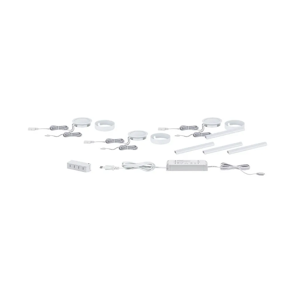 Dette færdigmonterede startsæt fra Clever Connect-serien består af tre Disc-møbler i hvid, en LED-driver med tilslutningskabel, tilslutningskabler og kabelkanaler samt klæbestrimler til fastgørelse og er klar til tilslutning uden yderligere tilbehør.