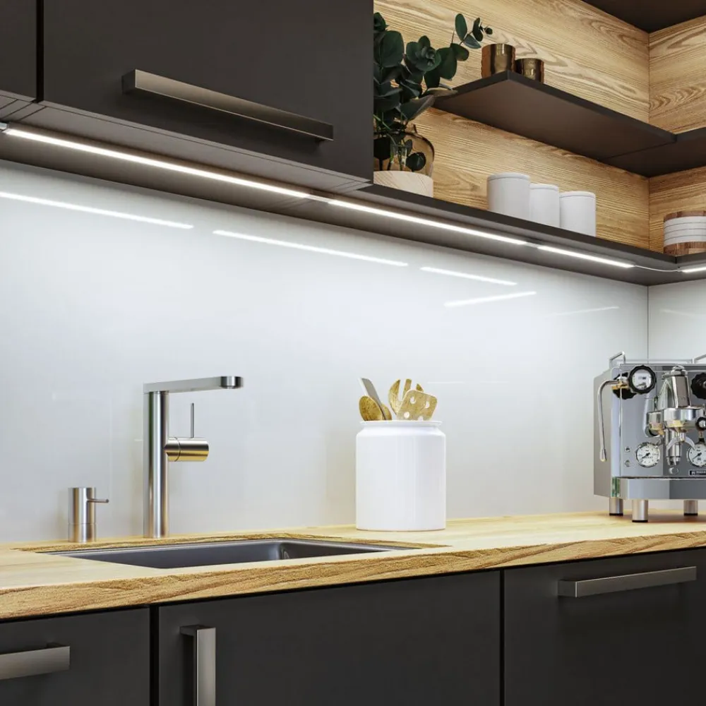 Moderne køkkenbelysning med bevægelsesstyring og justerbar lysfarve – LED underskabslampe Inline, startsæt med to lamper LED underskabslampen Inline er designet til funktionel belysning af køkkenets arbejdsflader. Den består af en slank aluminiumsprofil og en diffusor med overflader, der er nemme at rengøre. Der er integreret en PIR-sensor til betjening, så den kan betjenes berøringsfrit – praktisk og hygiejnisk. Lysfarven kan justeres fra varm hvid til dagslys ved blot at tørre sensoren af med hånden – Startsæt med to lamper, tilslutningskabel med plug-in-strømforsyningsenhed, tilslutningskabel, installationsmateriale – Kan suppleres med et forlængersæt (op til en maksimal samlet effekt på 24 W) – PIR-sensoren på den første lampe bruges til at styre alle andre tilsluttede lamper sammen – Hukommelsesfunktion gemmer den valgte lysfarve