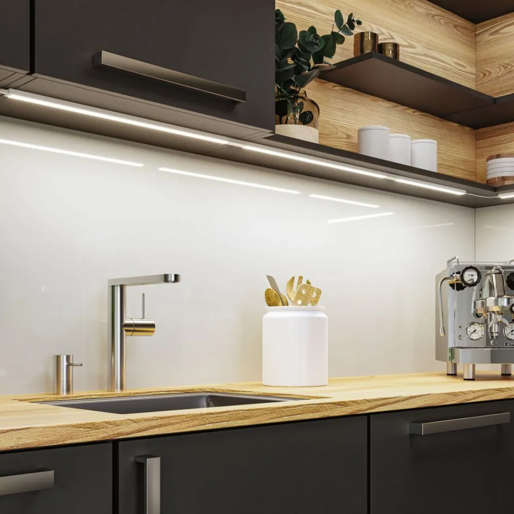 Moderne køkkenbelysning – LED underskabslampe Inline, forlængersæt med to lamper med CCT-funktion LED underskabslampen Inline er designet til funktionel belysning af køkkenbordplader. Den består af en slank aluminiumsprofil og skærm med rengøringsvenlige overflader og indeholder LED’er med justerbar lysfarve – udvidelsessæt med to lamper, tilslutningskabel, monteringsmateriale – designet til at supplere et startsæt (op til en maksimal samlet effekt på 24 W) – uden strømforsyningsenhed, uden afbryder – drift kun mulig i kombination med et Inline-startsæt!
