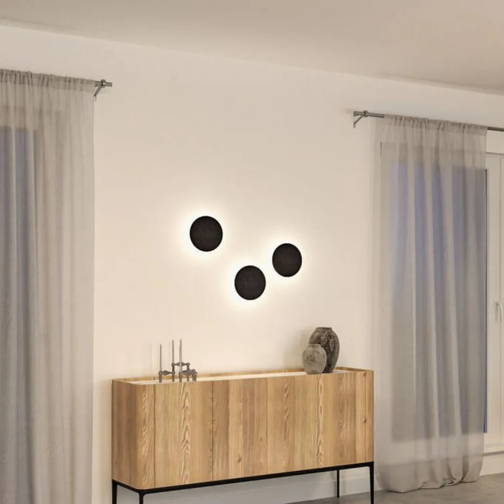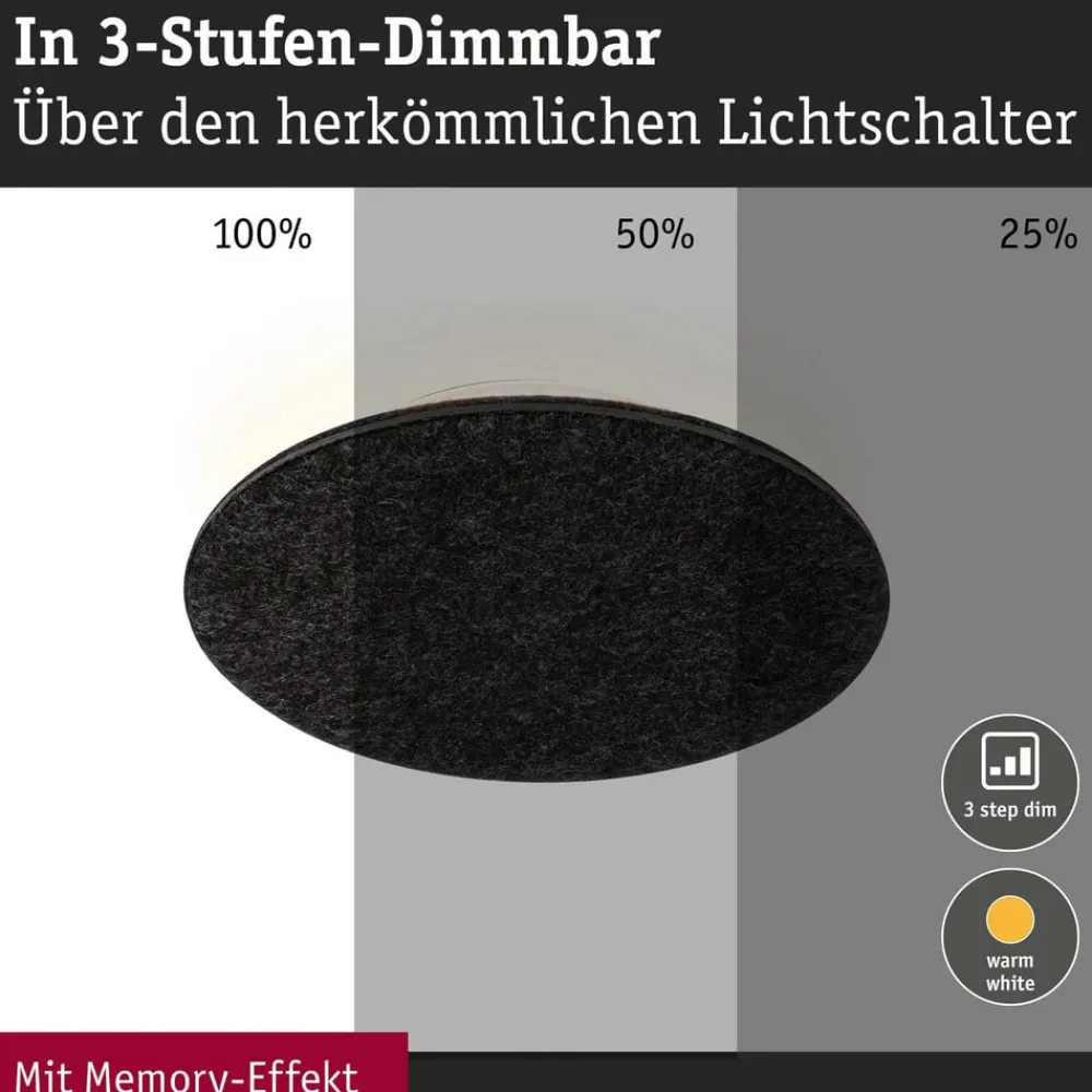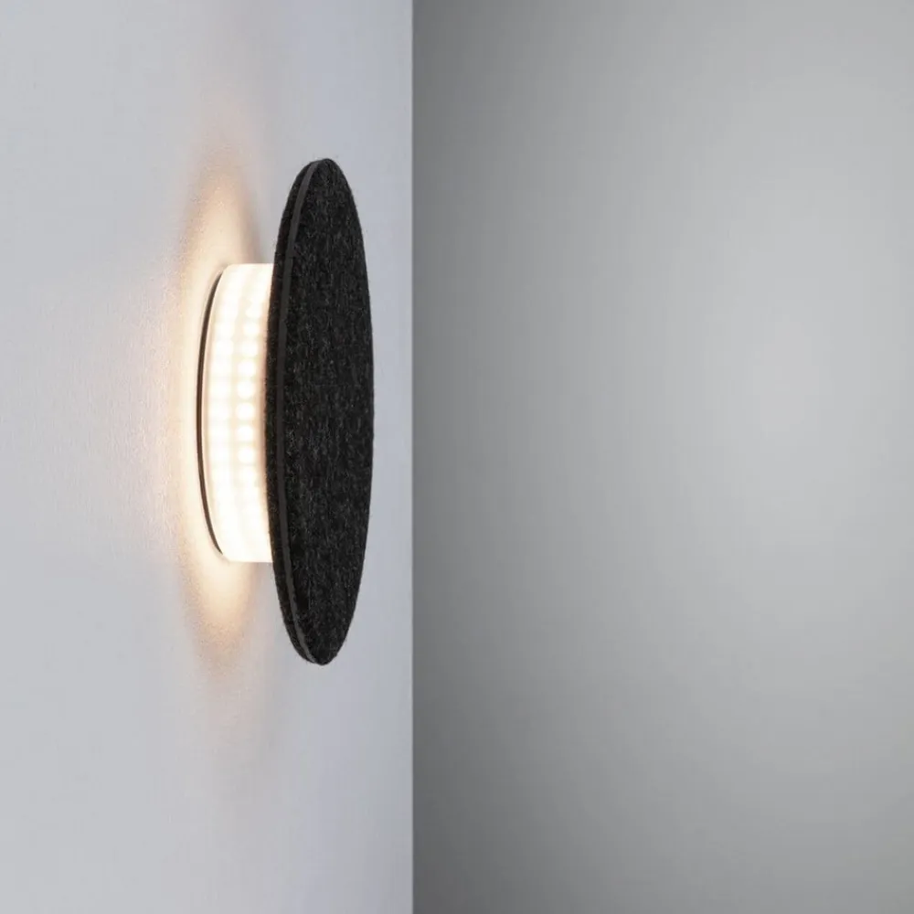Rund LED-væglampe Tulga med filtskærm i antracit og 3-trins dæmpningsfunktion, indirekte lysfordeling LED-væglampen Tulga kombinerer moderne design med funktionel lysteknologi. Den flade, runde lampeskærm er lavet af antracitfarvet filt, som består af mindst 60 % genbrugsmateriale. Det varmhvide LED-modul er placeret på bagsiden, så lyset udsendes indirekte og afskærmet fra forsiden. Ved hjælp af en almindelig vægkontakt kan lyset dæmpes i tre trin (100 %, 50 %, 25 %) ved at skifte Tulga hurtigt efter hinanden. Det tidligere aktive lysstyrkeniveau er tilgængeligt igen, når lyset tændes igen (hukommelsesfunktion). Filtmaterialet har en lyddæmpende effekt og understøtter dermed en god rumakustik.