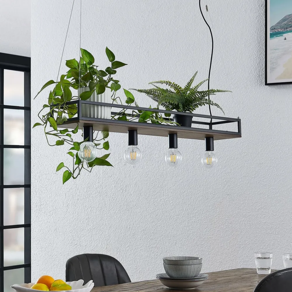 Kombination af fyrretræ og sort jern – Kirista-pendellampen med opbevaringsmulighed Denne pendellampe er et smukt blikfang i opholds- og spiseområdet, idet den kombinerer en træoverflade og et sort jernstel. På undersiden er der fire E27-fatninger, som kan monteres med pærer efter eget valg, og man bør være opmærksom på et dekorativt og stilfuldt udseende, da de er meget synlige og derfor en del af det samlede look. Toppladen i træ er indrammet i jernrammen og giver mulighed for at placere noget på den, f.eks. en lille urtepotte med en grøn plante. Det giver en designmulighed i stuen, som man ikke ser så tit, men som forstår at imponere med sine visuelle fordele, fordi planter og frisk grønt altid har en revitaliserende effekt. Hylden kan maksimalt belastes med 15 kg.