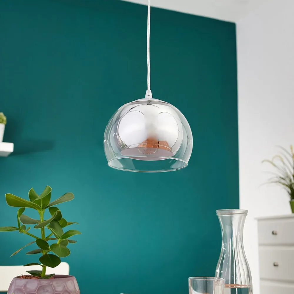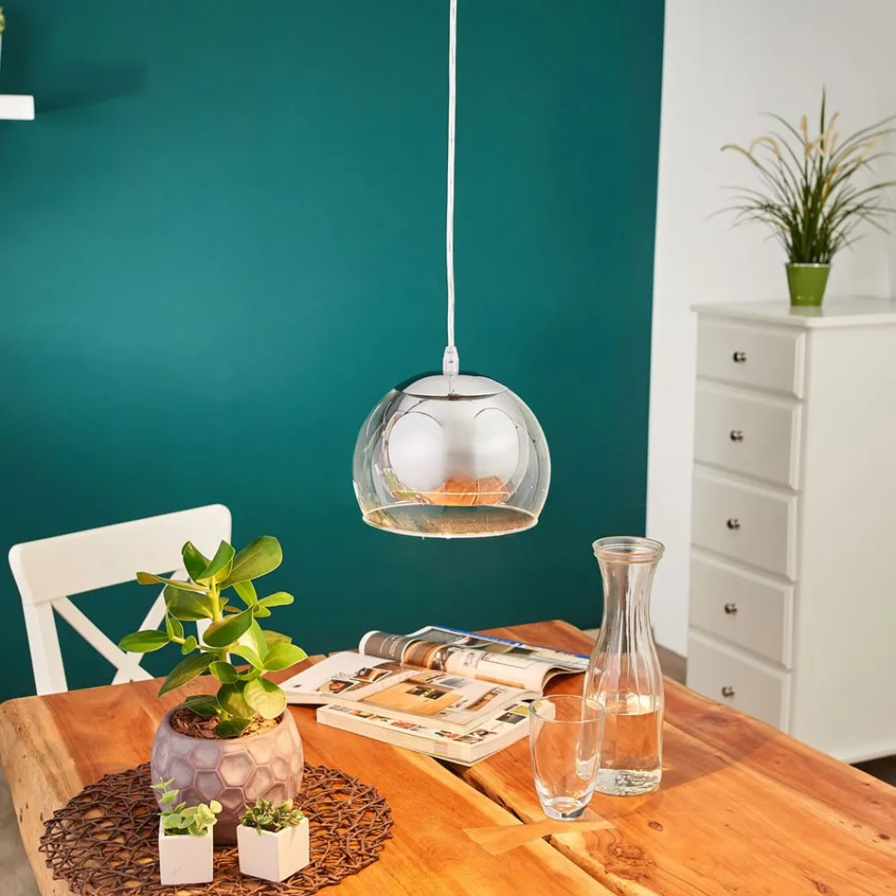 Elegant designet Rocamar-pendel Rocamar-pendlen med en enkelt lampe imponerer med sit ekstremt elegante design, som opnås ved skærmdesignet i to lag. Den ydre skærm er lavet af transparent glas, mens den indre skærm er lavet af forkromet metal. Den blanke kromfinish på den indre skærm giver armaturet et elegant udseende, som suppleres vidunderligt af det gennemsigtige glas. Lyset skinner nedad fra den indvendige skærm og fremhæver, sammen med glasskærmen, overfladen nedenunder på perfekt vis.