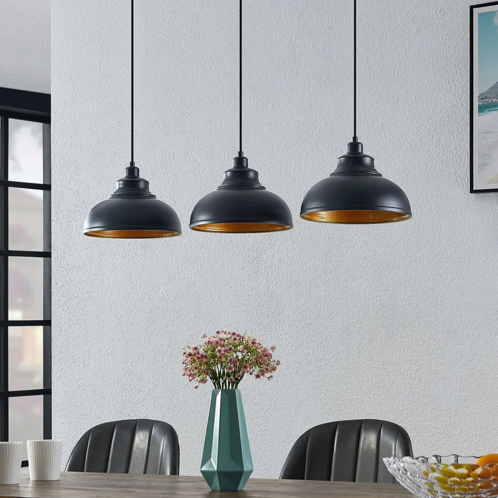Emna pendellampe til spisestuen med tre stålskærme i sort og guld Emna har et meget nostalgisk udseende med formen på sine lampeskærme i metal og kan kombineres perfekt med det populære vintagelook. Ydersiden af lampen er i mat sort, mens indersiden af skærmen skinner i dekorativt guld og ikke kun giver en kontrast, men også skaber smukke lysforhold, der er varme og indbydende. Emna hængelampen passer især godt over et spisebord, som kan belyses over et større område takket være de tre skærme. De sorte kabler er tekstilbelagte, og pæren skal være en, der primært er dekorativ, som det er tilfældet med filamentpærer. En ekstra varm lysfarve, som kan vælges som ekstraudstyr, forstærker den hyggelige effekt, som denne pendellampe med 3 lyskilder skaber.