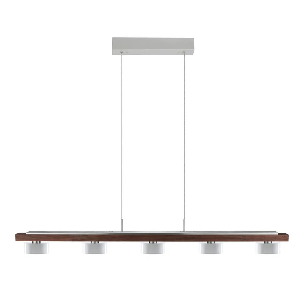 Estelle LED-hængelampe med træbjælke og glasskærme, der stråler opad og nedad Estelle LED-hængelampen kombinerer moderne design og naturlig udstråling til perfektion. Baldakinen og en strimmel på træpendlen er lavet af matbørstet nikkel med fem nedadvendte skærme af opalglas. De to kabler kan afkortes før installation, og højden på pendlen kan også justeres bagefter. Lysstyrken på de nedadrettede LED’er i glasskærmene og toplyset på stangen kan justeres separat ved hjælp af to berøringsdæmpere på stangen – Bæredygtigt træ fra FSC-certificerede leverandører – Dæmpbar: Dæmpning ændrer lysfarven – universalhvid for højt lysudbytte, varmhvid for lavt lysudbytte – Produceret i Tyskland