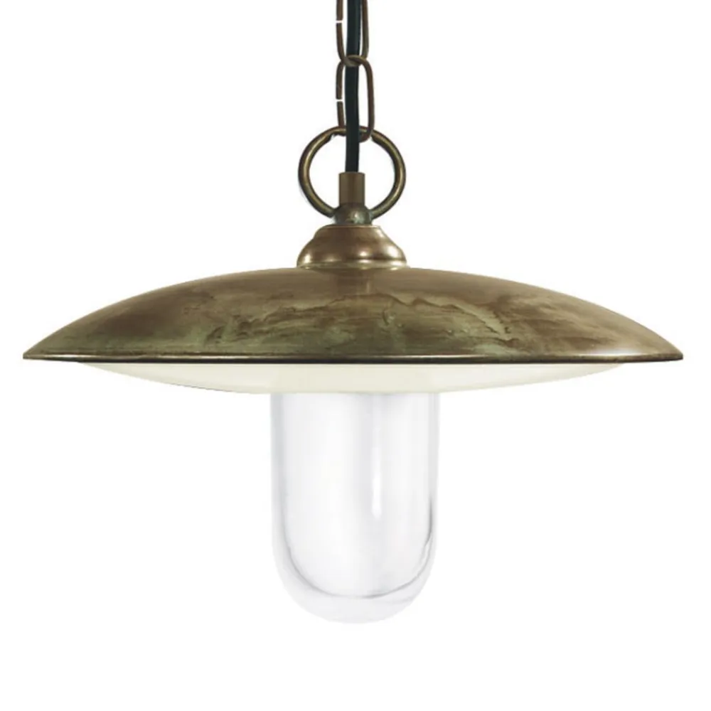 Golfo – robust, havvandsbestandig messingpendel Golfo-pendlen er perfekt til udendørs brug takket være dens høje korrosionsbestandighed og robuste massive messingkonstruktion. Lampeskærmens naturlige messingoverflade udvikler en smuk patina efter et stykke tid, hvilket giver lampen et særligt vintagepræg. Den indbyggede E27-fatning, som er omgivet af et beskyttende, klart lampeglas, kan monteres med alle typer pærer op til maksimalt 52 watt.