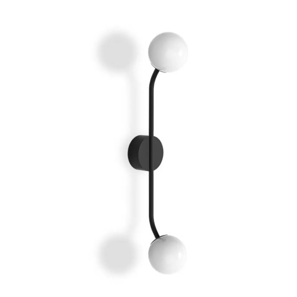Som en behagelig ekstra lyskilde og iøjnefaldende i en symmetrisk, lodret projicerende form beriger den to-flamme væglampe Pep ethvert moderne opholdsområde. Dine to nuancer er designet som strålende kugler lavet af satineret glas. Disse er fastgjort til enderne af en lang arm, der er let bøjet ind i rummet og lavet af jern, ligesom det runde vægbeslag.