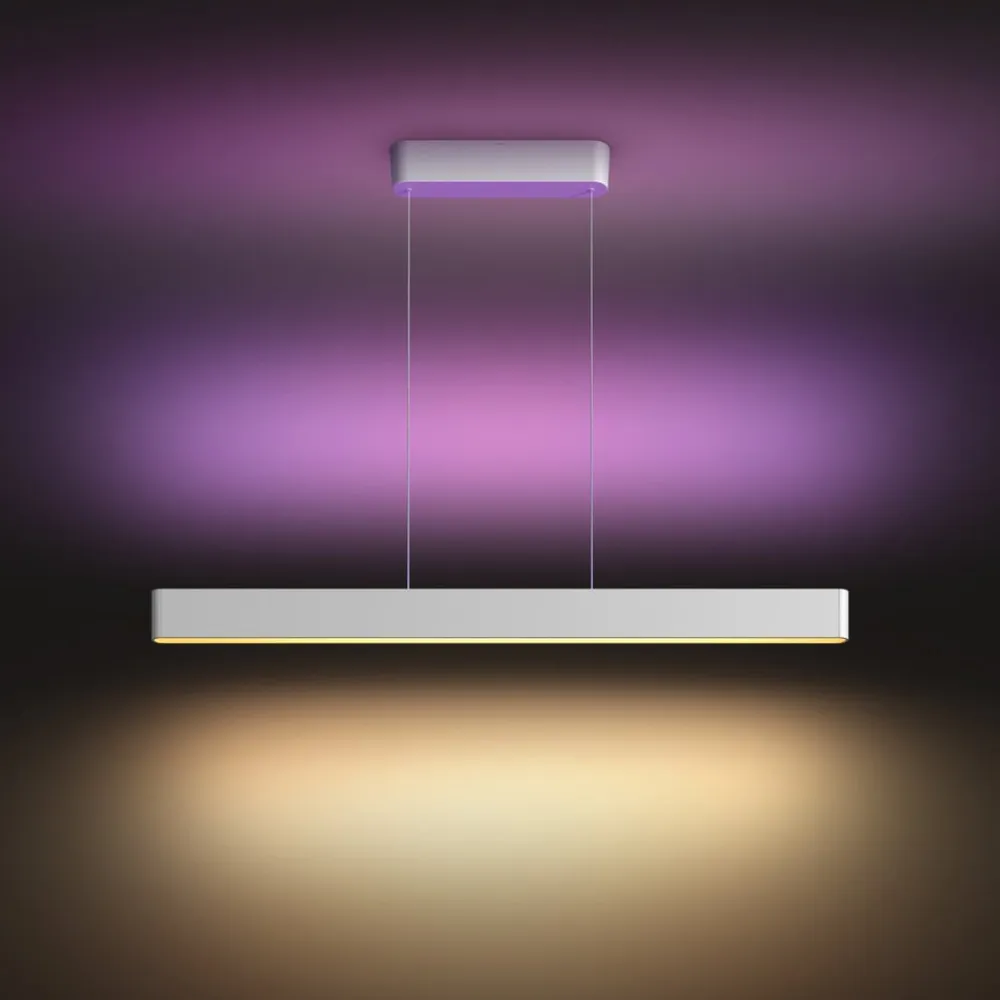 Ensis pendellampen er et absolut højdepunkt inden for alsidig og smart interiørbelysning. Den er udstyret med en opadgående og en nedadgående Hue-stribe i hvid og Color Ambiance-teknologi, som kan styres separat. På den måde opnås f.eks. direkte, hvidt, funktionelt lys og indirekte, farvestrålende rumbelysning på samme tid. Ensis er ideel til brug over borde i stuer og spisestuer.