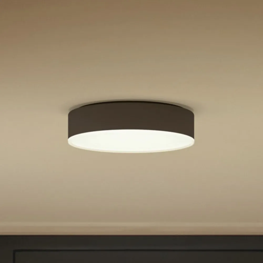 Philips Hue Enrave – smart styrbar LED-loftslampe med lysdæmper Den runde Hue Enrave LED-loftslampe giver klart lys over et stort område. Uanset om det er i stuen, gangen eller soveværelset, tilbyder Enrave justerbar lysstyrke og hvide toner i spektret fra varm hvid til dagslys, hvilket giver det rigtige lys på ethvert tidspunkt af dagen. Takket være den medfølgende lysdæmper kan loftslampen tændes, slukkes og dæmpes direkte. Alternativt kan lyset også styres via Bluetooth ved hjælp af din egen smartphone uden behov for yderligere enheder. Smart integration i et eksisterende Philips Hue smart home-system via Hue Bridge (se tilbehør) er også mulig.