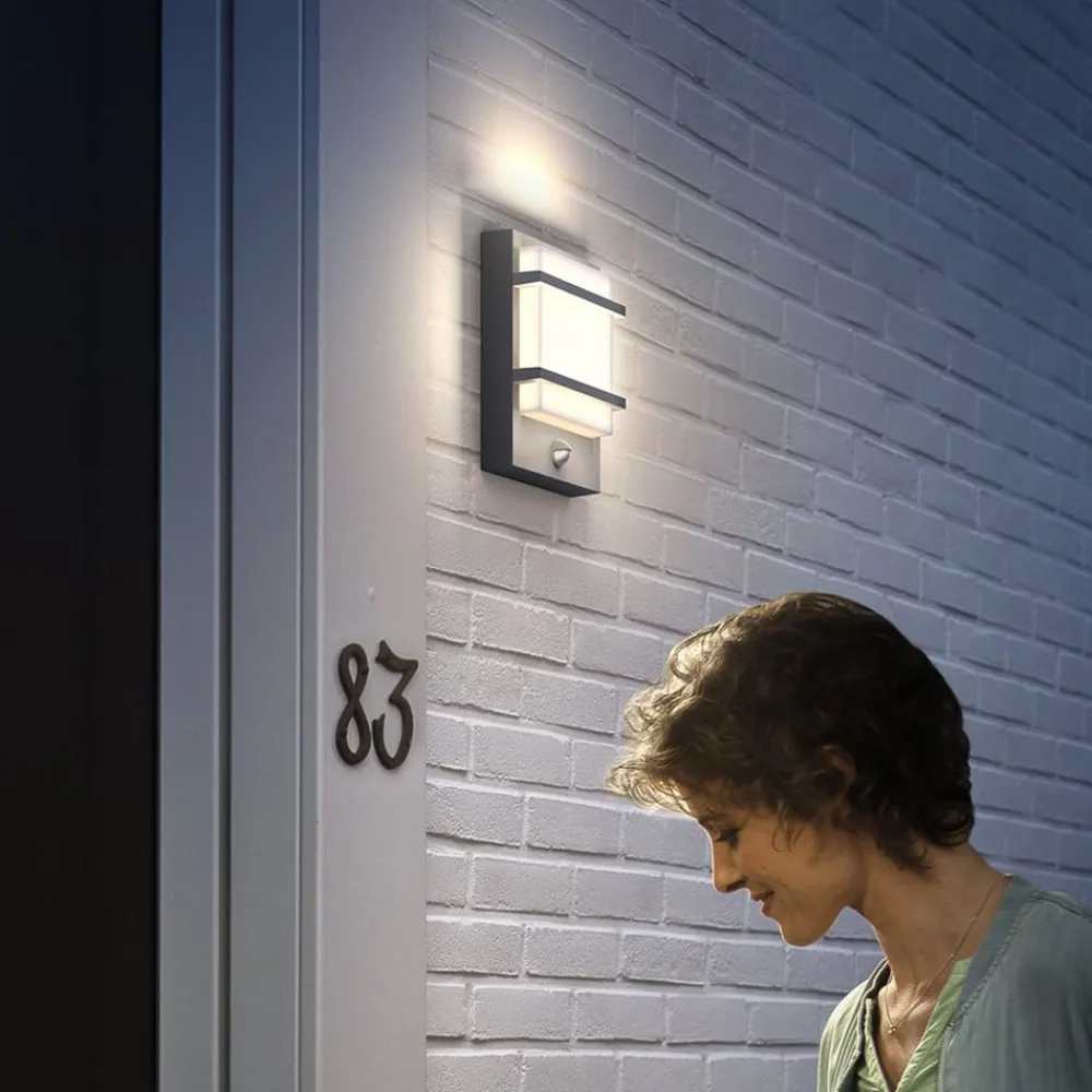 Med bevægelsessensor og ultraeffektivt LED-modul: Petronia LED udendørs væglampe Petronia udendørs væglampe er fremstillet af robust aluminium med en antracitfinish og passer med sit tidløse look ind i mange facadedesigns. Lyskilden er et ultraeffektivt LED-modul fra Philips, som bruger op til 50 % mindre strøm end konventionelle LED-lys fra Philips. Den integrerede bevægelsessensor sikrer, at lyset kun tændes, når der er brug for det. Sensorens tekniske data: Registreringsvinkel: 110°, afstand: 0-10 m, lysvarighed: 5 sek-12 min, dagslysfølsomhed: 30-200 lux