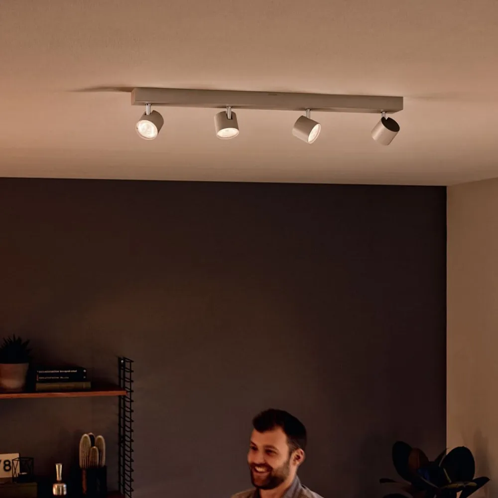 LED loftspotten Star med fire lyskilder tilbyder en hyggelig stemning til mange forskellige lokaler, for de indbyggede LED’er kan ikke bare dæmpes med stort set alle lysdæmpere, men ændrer også lysfarve i løbet af dæmpningen. Jo svagere lyset bliver, des varmere og dermed hyggeligere bliver lysfarven. På den måde kan der ud over den almene belysning af et rum, som forekommer utroligt behageligt på grund af det varmhvide lys, også virkeliggøres en behagelig belysning til at slappe af ved eller en blød baggrundsbelysning til at se fjernsyn ved om aftenen. Derudover kan de fire spots dreje og vippe, så at deres lys kan skinne i forskellige retninger. Med ClickFIX-systemet er monteringen ordnet i bare fire nemme skridt.