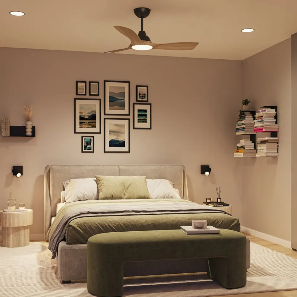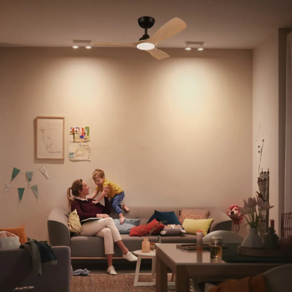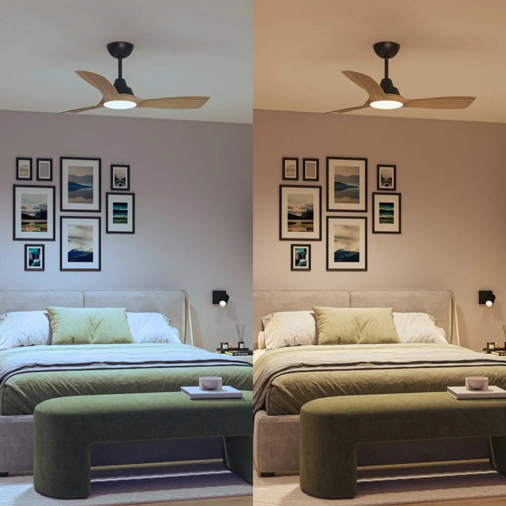 LED-loftventilatoren Olas med lampe kombinerer dæmpbart, individuelt tilpasseligt lys med komforten ved en loftventilator med brede vinger, der giver en generøs luftstrøm. Med CCT-funktionen og fjernbetjeningen er det nemt at skabe den perfekte belysning i ethvert rum.