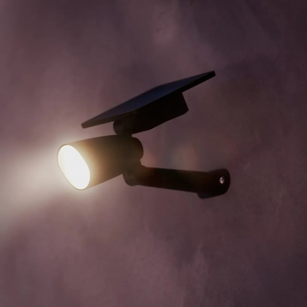 Den solcelledrevne LED-udendørs spot Ashlyn kan stikkes ned i jorden med jordspydet, men kan også monteres på væggen. Den udsender varmhvid belysning og er ideel til at skabe dekorative accenter i hele udendørsområdet uden energiforbrug.