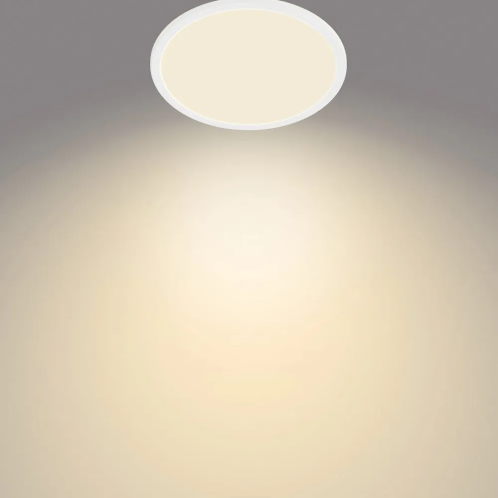 LED-loftlampe Superslim IP44, dæmpbar via lysafbryderSuperslim er en rund LED-loftlampe fra Philips, der er egnet til brug på badeværelset og i andre fugtige rum takket være IP44-beskyttelsen. De indbyggede varmhvide LED’er kan dæmpes uden en lysdæmper via lyskontakten. Ved at skifte flere gange kan du vælge mellem 100 %, 50 % eller 10 % lysstyrke. Armaturet opfylder EyeComfort-kriterierne udviklet af Philips og giver et behageligt lys, der er skånsomt for øjnene – også egnet til vægmontering – med hukommelsesfunktion