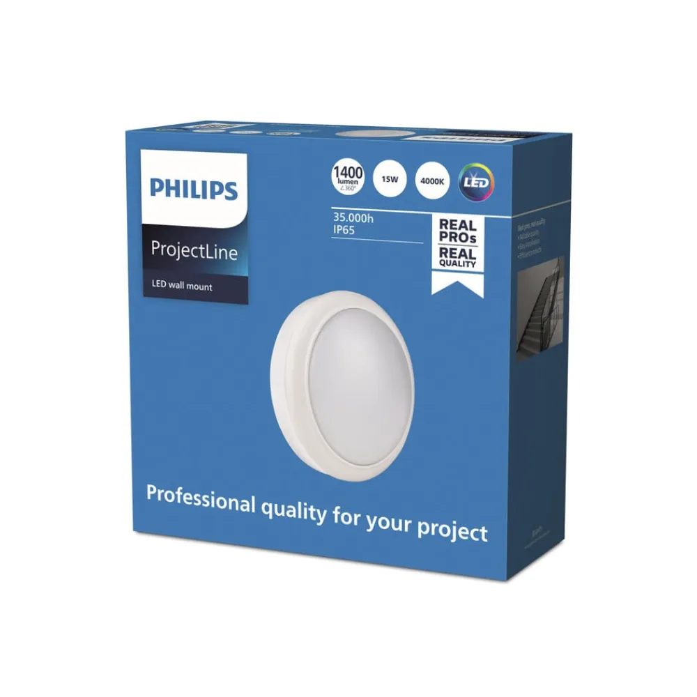 Rundt LED ProjectLine vægarmatur med universelt hvidt lys LED-vægarmaturet fra ProjectLine-serien fra Philips er den ideelle lyskilde til korridorer og trapper – både i private og kommercielle områder. Den er udstyret med effektive LED’er, der udsender et universelt hvidt lys. LED-armaturet kan opstilles enkeltvis eller med flere ved siden af hinanden, så det kan give en solid og jævn belysning med sit naturlige hvide lys. Takket være det diskrete design i hvidt og den runde form kan den også nemt integreres overalt.LED-teknologien fra Philips er kendetegnet ved et lavt strømforbrug. Philips LED-lamper sparer energi fra det øjeblik, de tændes, fordi armaturet bruger færre kilowatt i hele sin levetid og dermed også bidrager til lavere eludgifter.