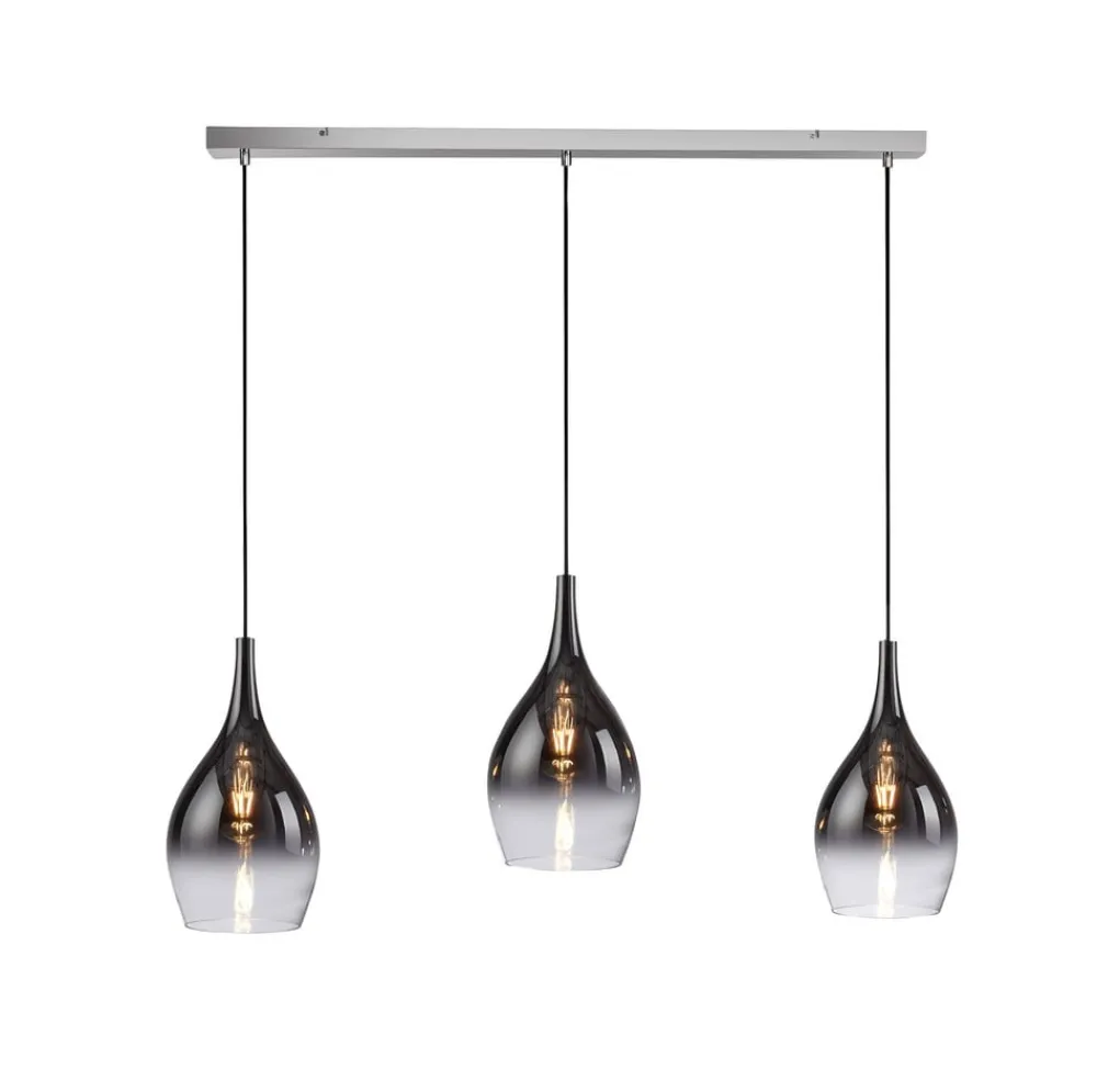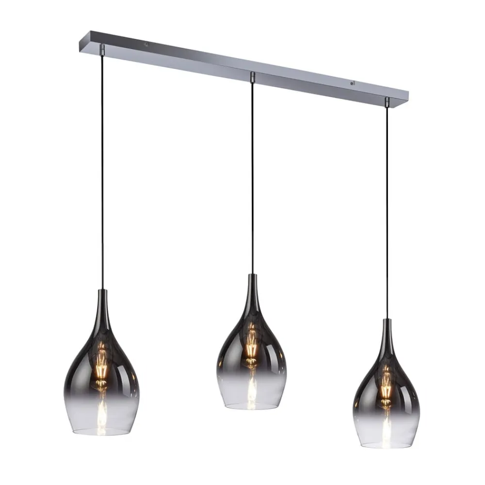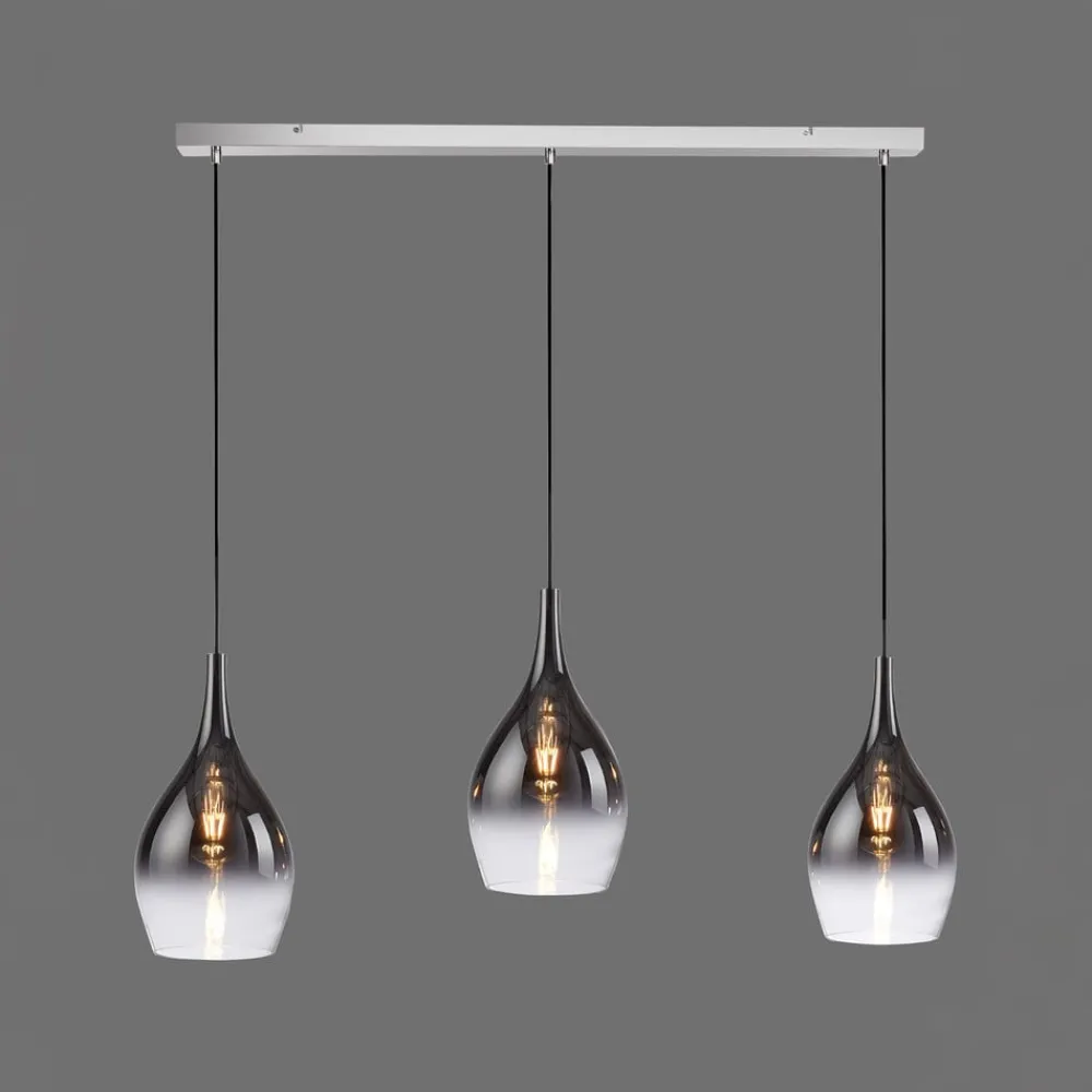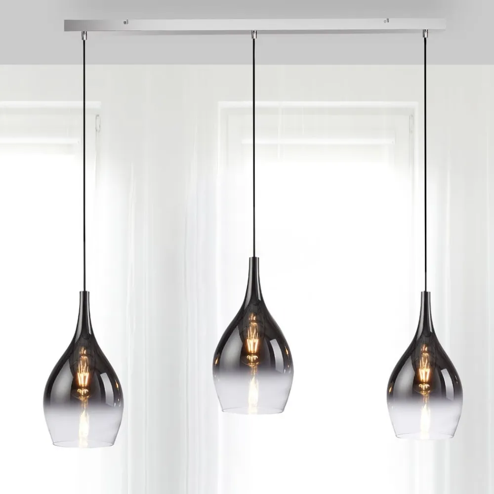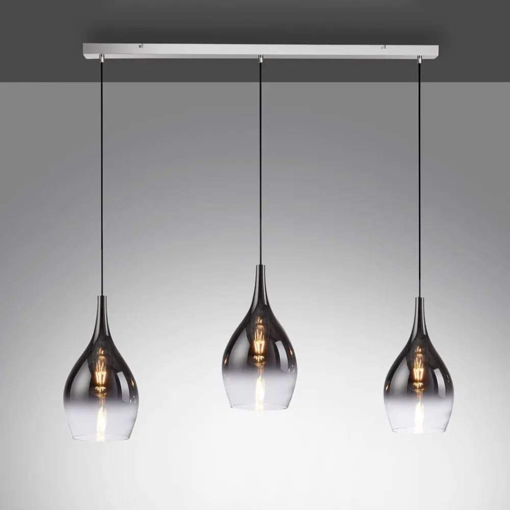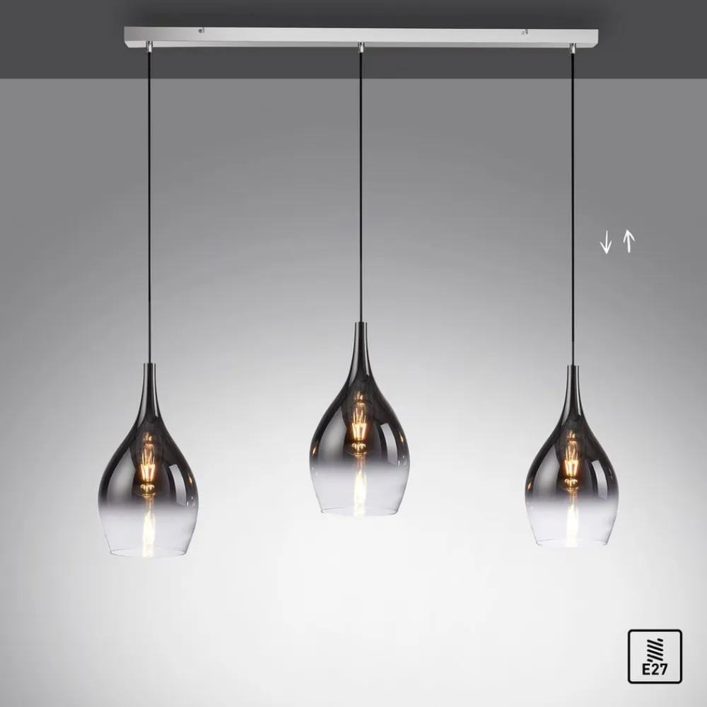 Pilua hængelampe med lampeskærme af røggråt glas Denne smukke hængelampe er særligt velegnet til montering over spisebordet. Den passer perfekt ind i moderne indretningsstile. Hængelampens aflange loftskasse er farvet i en sofistikeret kromfarve. De tre dråbeformede lampeskærme er fastgjort til baldakinen i forskellige længder og har en farvegradient fra røget grå til hvid – hvilket gør lampen til et højdepunkt i dit hjem. Lampen er udstyret med tre E27-pærer (medfølger ikke).