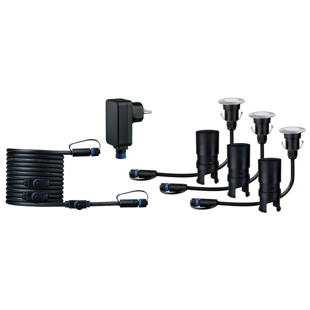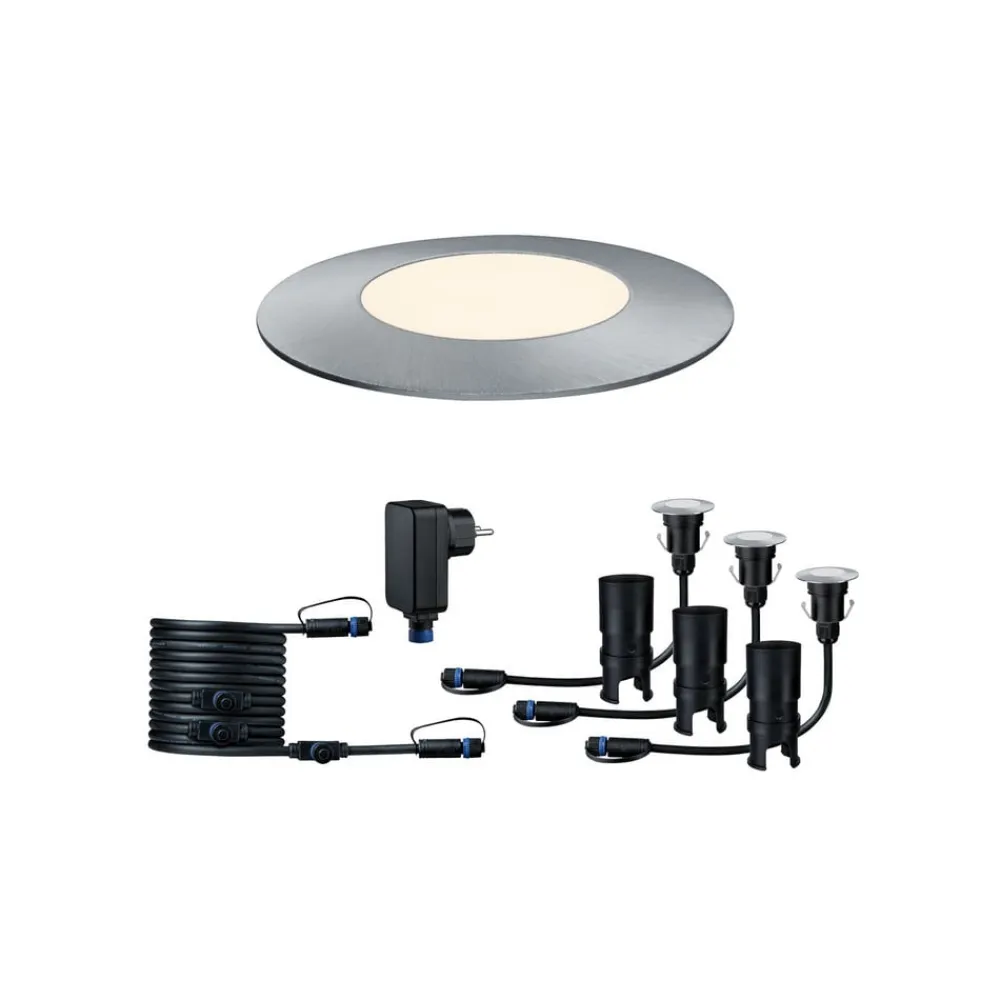 Lille og rund nedgravningslampe Plug & Shine Mini, Basis-sæt med tre lamper Dette sæt med tre små Plug & Shine Mini-nedgravningslamper er ideelt som en selvstændig løsning til diskret belysning af moderne udendørsarealer. Takket være den medfølgende plug-in-transformer, installationsmufferne og tilslutningskablet (udgange til 200 cm, 350 cm, 500 cm, 515 cm) er der ikke behov for yderligere tilbehør til idriftsættelse. Hvis det er nødvendigt, kan der fås ekstra tilbehør som controllere osv. til at udvide systemet efter behov. Installation er mulig både i jorden og i mellemgulve med en tykkelse på 0,3 til 2 cm (på verandaer osv.). Det runde design med ramme i rustfrit stål og afdækning i mat plast er visuelt afdæmpet – Med en driftsspænding på 24 V og vandtætte kabler, tilslutninger og lamper er Plug & Shine fra Paulmann en alsidig og sikker belysningsløsning til udendørsarealer – Leveringsomfang: tre lamper, tre installationsmuffer, plug-in-transformer, tilslutningskabel – Yderligere kabler osv. er tilgængelige via tilbehøret fås via tilbehøret – Kan altid tændes og slukkes via lyskontakten – Der kræves en controller til fjernbetjening (se tilbehør) – Modstandsdygtig over for poolvand – Plug & Shine er velegnet til integration i Smart Friends til styring via Smart Friends-appen (til iOS og Android). Der kræves en ZigBee-controller til dette (se tilbehør). Plug & Shine kan også integreres i andre ZigBee-kompatible smart home-systemer (f.eks. til stemmestyring via Amazon Alexa), hvortil der kræves den respektive gateway – maks. kabellængde strømkilde – armatur: 50 m