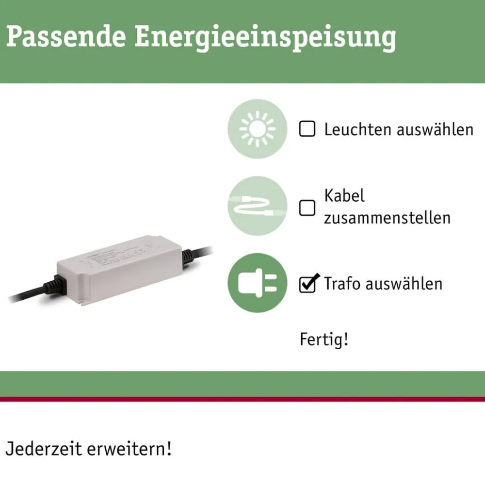 Strømforsyning med stik, kabel og transformer til Plug & Shine udendørslamper, maks. 75 W Denne strømforsyning er en praktisk løsning til tilslutning af Plug & Shine udendørslamper med op til 75 W til 230 V-nettet. Den består af et sikkerhedsstik, et kabel, en 230 til 24 V-transformer placeret på det og en specifik Plug & Shine-udgang. Takket være kablet kan der bygges bro over afstanden til nærliggende armaturer uden behov for en forlænger – Systemets samlede kabellængde kan udvides til maks. 50 m