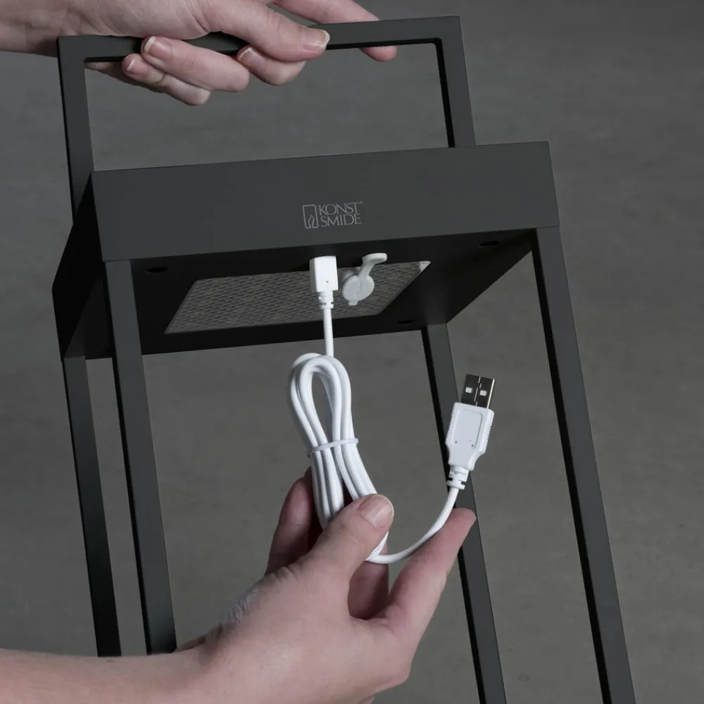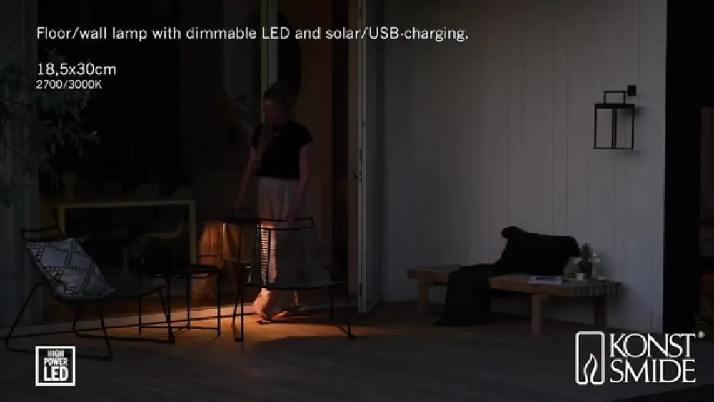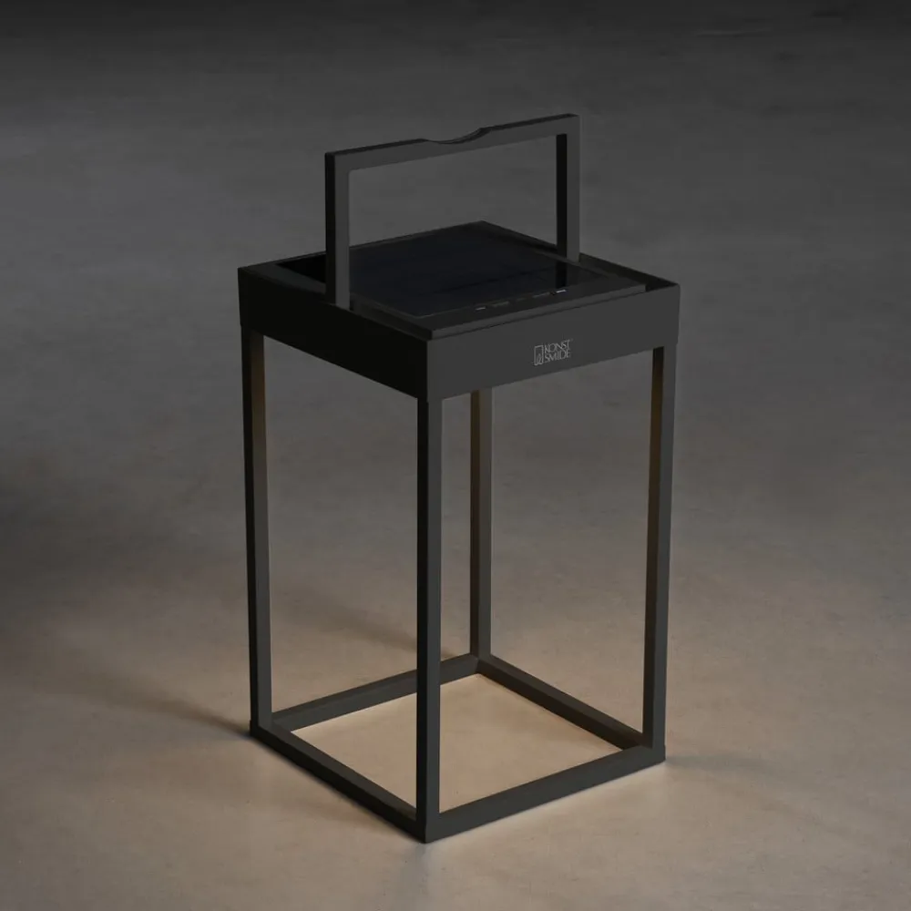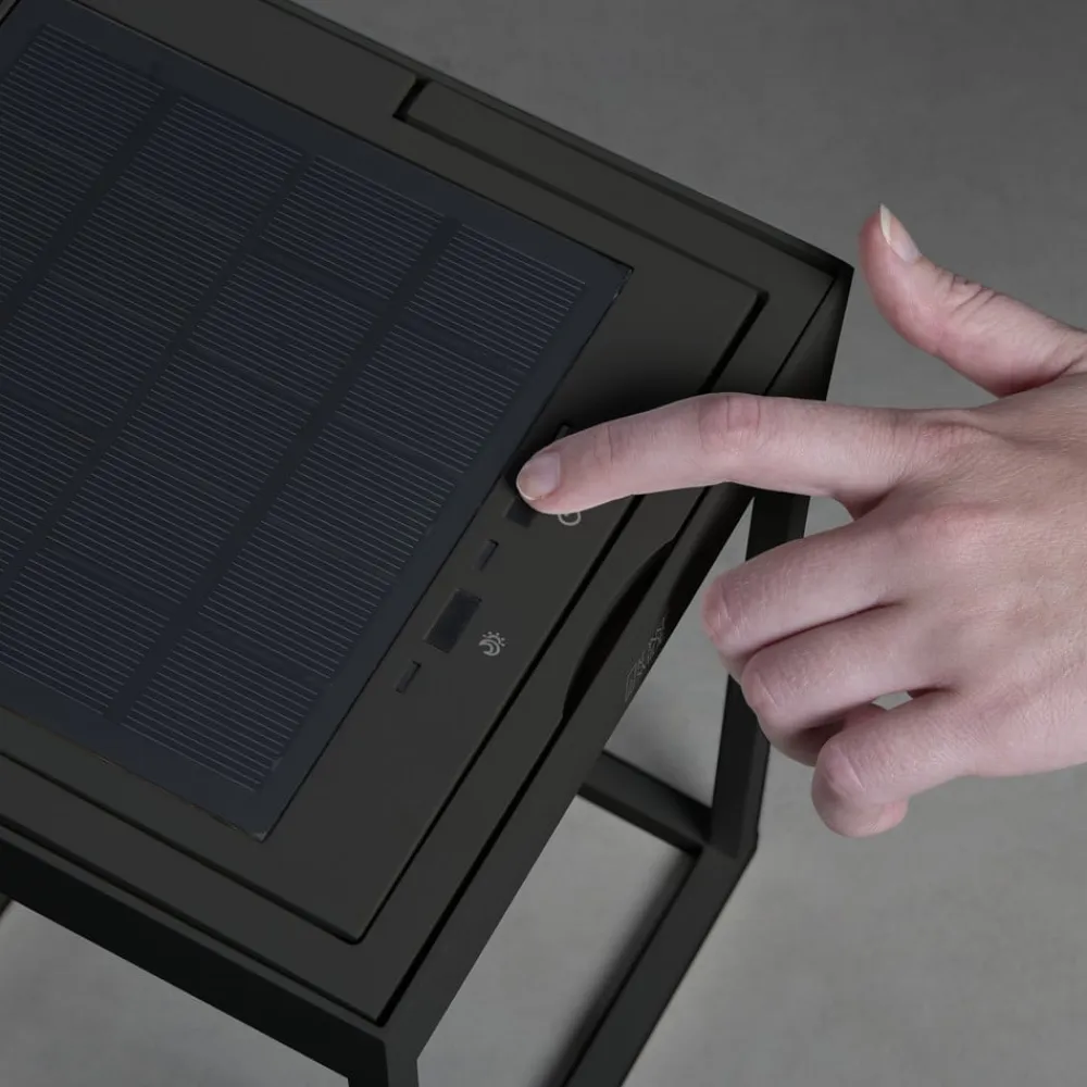 Portofino udendørs LED-lanterne til væg eller bord – genopladelig via USB-kabel eller solpanel Den dekorative Portofino udendørs LED-lanterne tilbyder alsidighed i enhver henseende. Takket være sit design som en moderne lanterne i en åben, ensfarvet kubisk form, passer Portofino ubesværet ind i enhver atmosfære. Det integrerede genopladelige batteri muliggør drift uden ekstern strømkilde. Den oplader sig selv via det integrerede solpanel på toppen. Hvis der ikke er tilstrækkeligt lys i omgivelserne, kan opladningen alternativt ske via det medfølgende USB-kabel. Lysstyrken på lysdioderne, som er integreret under toppen og lyser nedad, kan dæmpes fra 100 til 5 % efter behov ved hjælp af berøringskontakten på lampen. Farvetemperaturen kan også ændres mellem 2.700 og 3.000 K. Armaturet giver også stor fleksibilitet med hensyn til, hvor det kan bruges. Det kan placeres overalt i stuen, på terrassen, camping- eller havebordet eller monteres på væggen ved hjælp af det medfølgende beslag – inkl. USB-ladekabel – opladningstid: ca. 2,5 timer via kabel, ca. 20 timer via solpanel (afhængigt af omgivende lys) – brændetid pr. opladning: 9 timer ved 100 %, 20 timer ved 50 % lysudbytte – med skumringssensor til automatisk skift baseret på omgivende lysstyrke