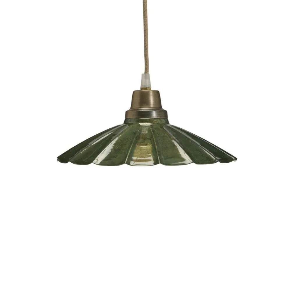 Den runde, åbne lampeskærm på hængelampen Ester i jern har en farvet emaljeret finish. Kombineret med de messingfarvede detaljer over lampeskærmen skaber det en lampe med en tiltalende vintage charme. Strømforsyningen sker direkte via en stikkontakt; hængelampen Ester er derfor udstyret med et stik med fastgørelseskroge.