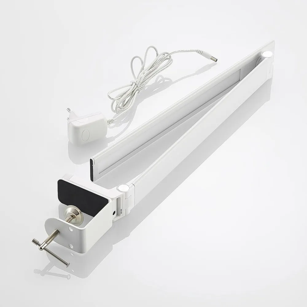 Hvid Tamarin LED-bordlampe med 6-trins lysdæmperfunktion Tamarin LED-bordlampen har en neutral hvid farve og harmonerer meget godt med moderne indretningsstile. Den kan nemt sættes fast på bordkanten med den 6 cm lange klemme. De kraftige LED’er udsender et universalhvidt lys, der kan dæmpes i 6 niveauer, hvis det er nødvendigt. På den måde sikrer Tamarin perfekte arbejdsforhold på skrivebordet.