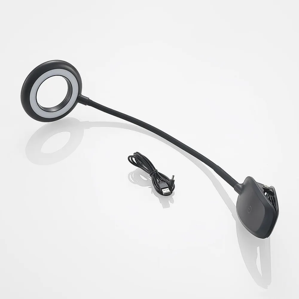 Trinløst dæmpbar Harumi LED-klemmelampe med bevægelig lysarm Harumi er en lille LED-klemmelampe udstyret med fremragende LED-teknologi. Det ringformede armaturhoved har fastmonterede, kraftige LED’er, hvis lysstyrke kan reguleres individuelt efter behov. Denne økonomiske lygte kan oplades med et USB-kabel og bruges, hvor der er brug for den, takket være den integrerede klemme.