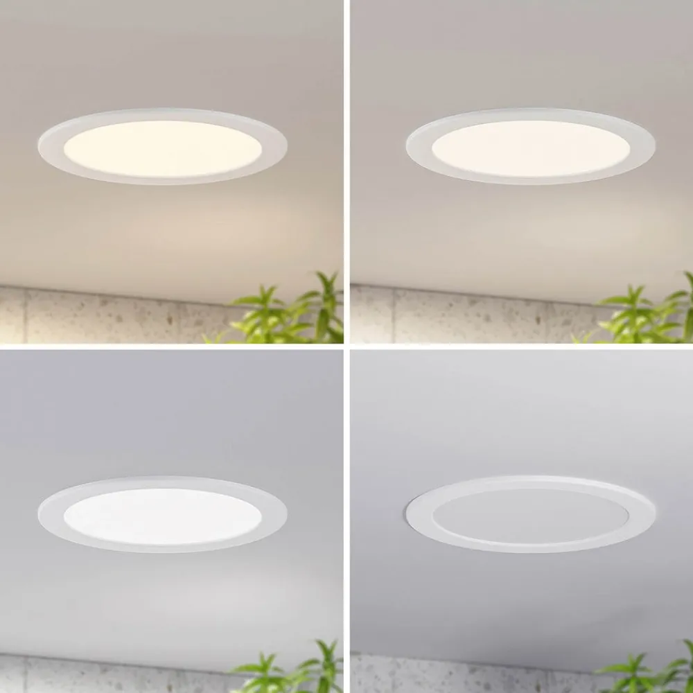 Rund, dæmpbar Cadance LED-indbygningslampe i hvid, forudindstillelig lysfarve, IP44 LED-indbygningslampen Cadance har et særligt væld af funktioner, fordi den kan mere end bare at lyse, men dens udseende er yderst dæmpbar med sin runde form og hvide overflade. Indbygningslampen kan derfor bruges på mange forskellige måder, både i private rum og i et kommercielt miljø. Med sin højere kapslingsgrad er Cadance godt beskyttet mod fugt og kan derfor også bruges i badeværelser og andre fugtige rum. En DIP-kontakt på huset gør det også muligt at vælge lysfarve efter behov før installationen. LED’erne kan til enhver tid dæmpes eksternt, forudsat at der er installeret en passende lysdæmper. Alt dette gør det muligt at tilpasse belysningen til den specifikke situation på stedet. Installationsdiameter: – Variant 1 (11,5 cm): 10-11 cm – Variant 2 (17 cm): 15-16 cm – Variant 3 (22 cm): 20-21 cm – Variant 4 (24 cm): 22-23 cm