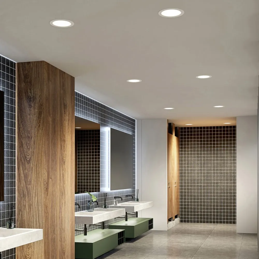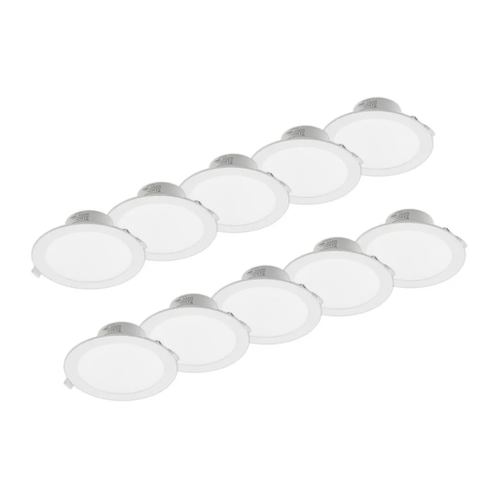 Stor LED-downlight Rida med rund, hvid indfatning; lysfarve kan styres via DIP-kontakt, IP44, sæt med 10 stk. Rida er en praktisk lyskilde med forholdsvis store dimensioner for en indbygningslampe, som kan bruges på mange forskellige måder både privat og kommercielt. Den høje kapslingsgrad gør den også velegnet til brug i fugtige rum, da fugt ikke kan skade indbygningsspottet, hvilket gør den ideel til belysning af badeværelser. Det enkle design med hvid overflade og rund form passer ind i mange moderne miljøer, men er i bund og grund også ret tidløst. Du kan derfor bruge LED-downlight’en, hvor du vil. Lysstyrken på LED’erne kan også reguleres efter behov, og der findes en ekstern dæmper. Muligheden for at variere lysfarven via en DIP-kontakt er særlig interessant, selv til kommerciel brug. På den måde kan den passende lysfarve vælges og indstilles før installationen. En relativt bred strålevinkel muliggør bred rumbelysning, hvorved flere indbygningsspots kan bruges i større rum til at give lys, bred belysning – CCT-farveindstilling mulig via DIP-kontakt før armaturinstallation – IP44, høj kapslingsgrad til brug i fugtige rum – dæmpbar – bred strålevinkel til bred rumbelysning – leveres i et praktisk sæt med 10 stk