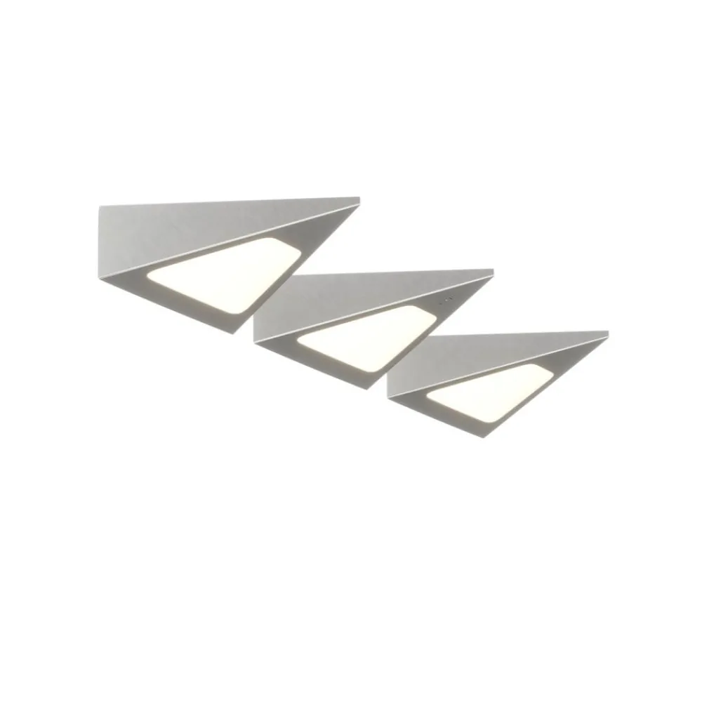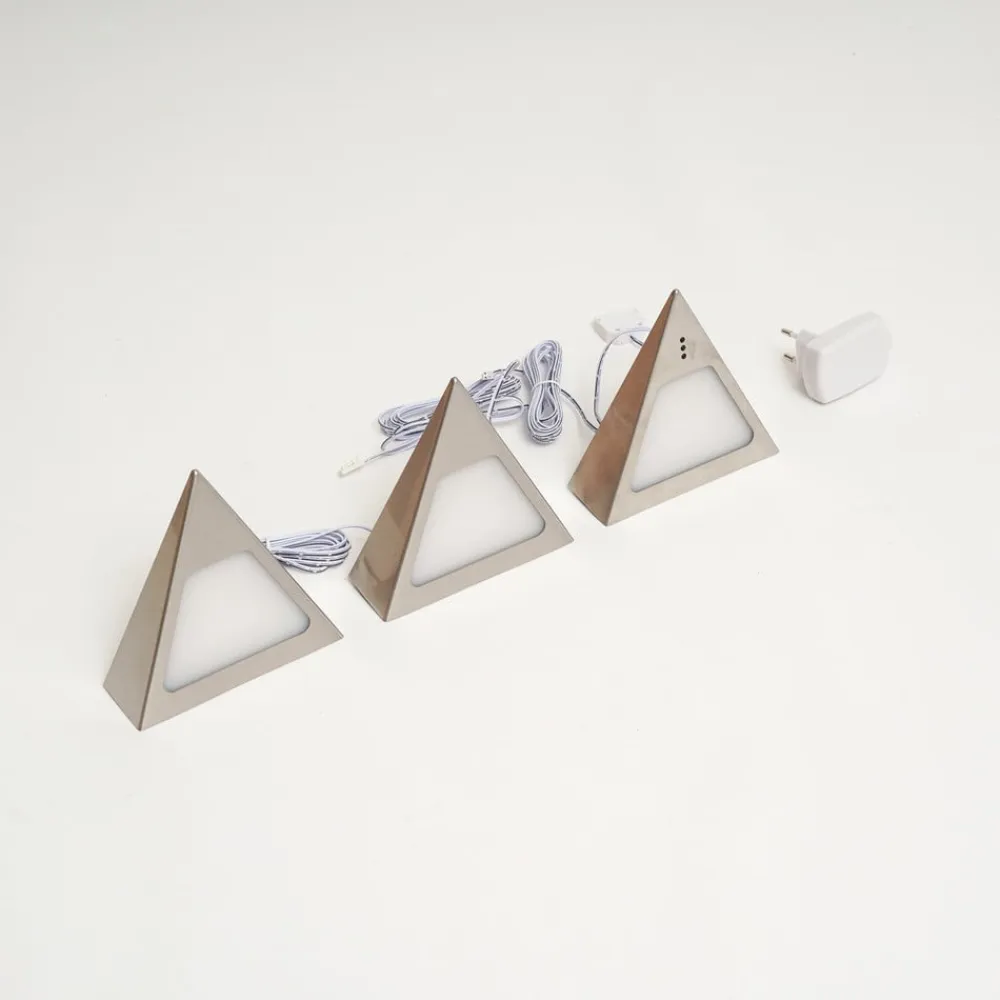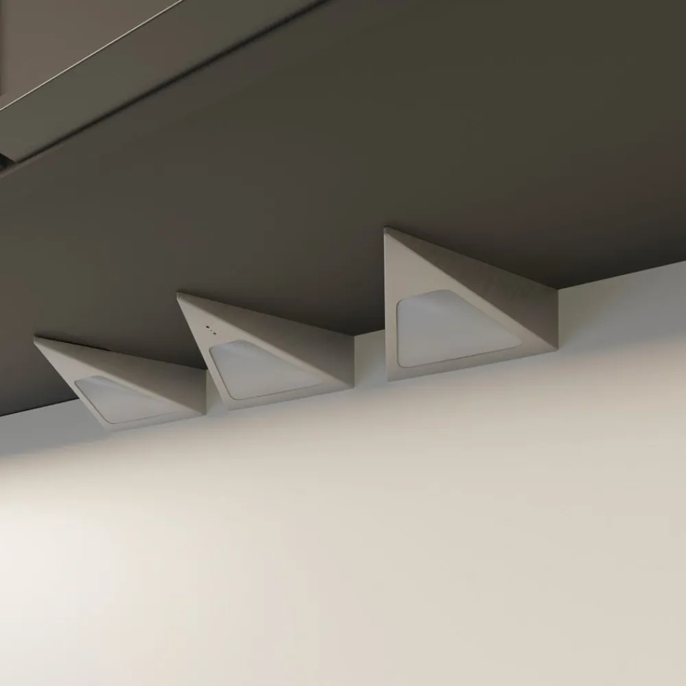 LED-underskabsbelysningen Odia har tre pyramideformede elementer, der er forbundet med hinanden ved hjælp af et kabel på to meter. Takket være længden af dette strømkabel kan lampen installeres fleksibelt. Inde i elementerne sidder varmhvide LED’er, der sikrer en behagelig belysning og en passende stemning. Med hjælp fra sensorstyringen kan LED-underskabsbelysningen Odia betjenes med håndbevægelser. Med en enkel håndbevægelse kan lampen tændes og slukkes, og ved at dække sensoren kan den dæmpes trinløst. Netstikket er særligt fladt, så det nemt kan placeres bag skabe.
