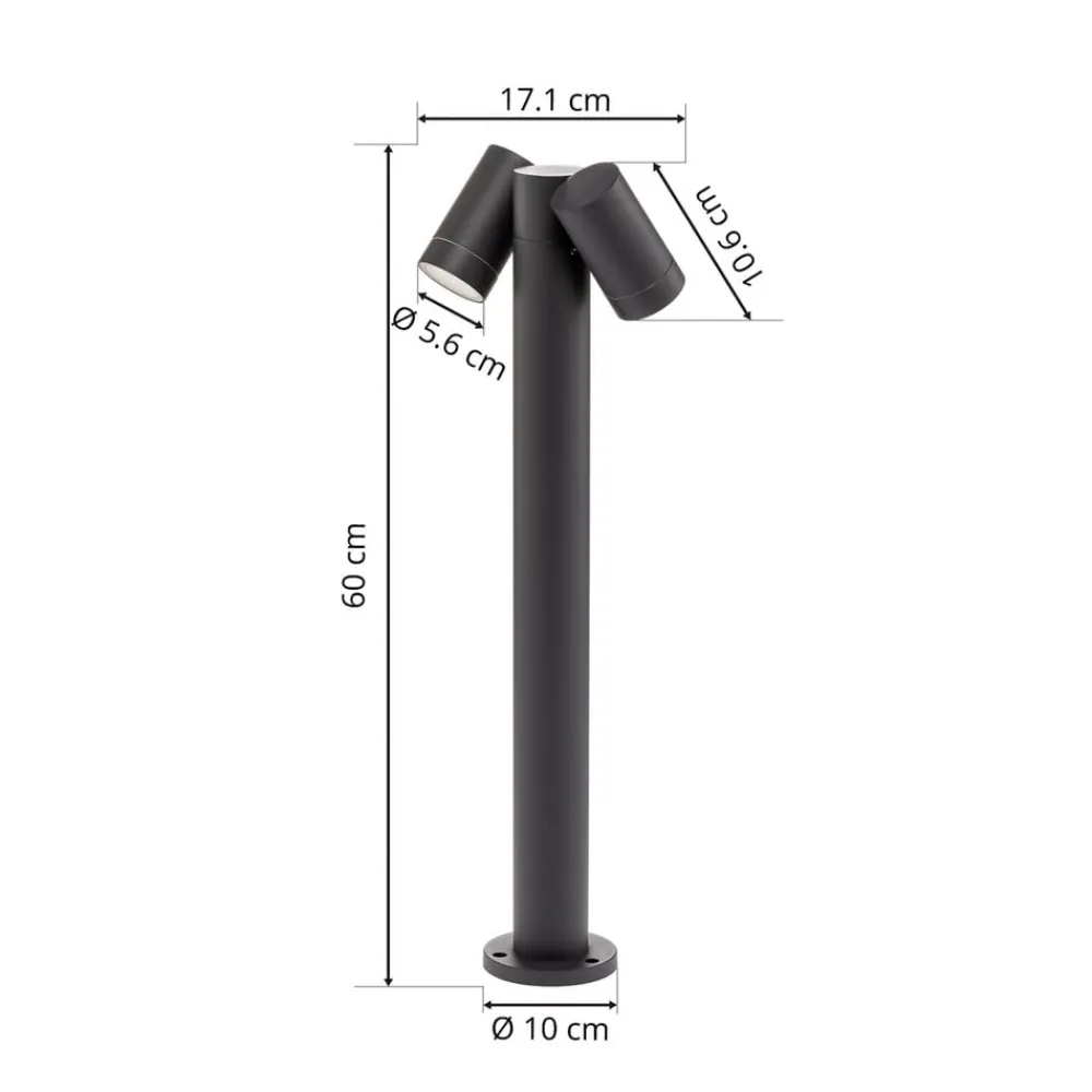 Mørkegrå Tulimar vejlampe med to bevægelige spots Tulimar vejlampen kommer i en 2 lyskilder version og imponerer med sit trendy look, der passer perfekt ind i moderne omgivelser. Den er ideel til belysning af havestier og kan også bruges i nærheden af en terrasse eller indkørsel. Den gode kapslingsgrad sikrer, at denne vejlampe kan modstå vind og vejr i udendørs områder på lang sigt. De to spots kan udstyres med passende pærer efter behov og kan også justeres fleksibelt.