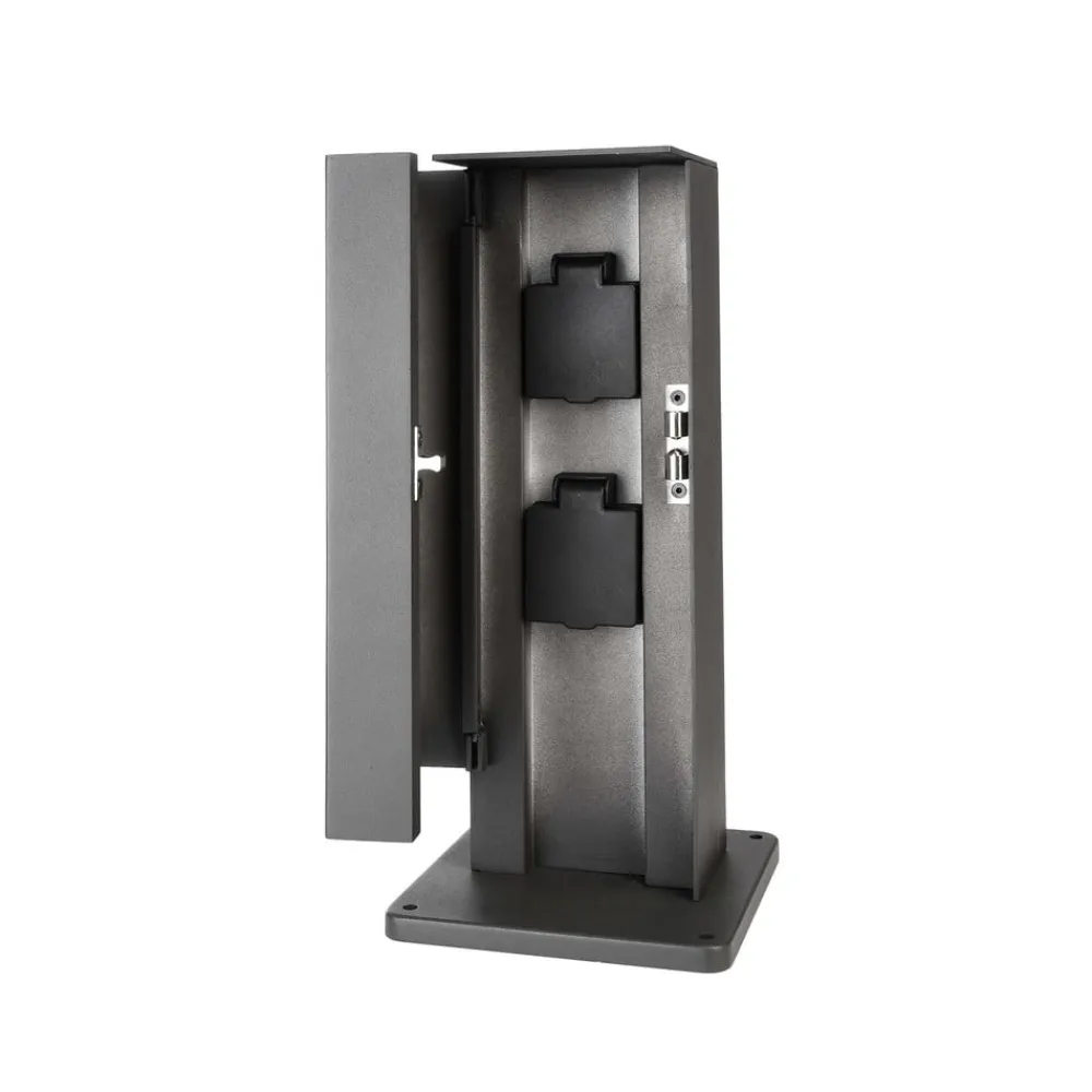 Puka Mana er fremstillet af trykstøbt aluminium af høj kvalitet og er udført i en mørkegrå farve, der understreger den tidløse, diskrete effekt. Takket være den høje beskyttelsesklasse IP54 er Puka Mana perfekt egnet til udendørs brug og muliggør drift af elektriske enheder. Den har to stikkontakter bag en beskyttelsesklap, som kan belastes med maksimalt 3.650 watt