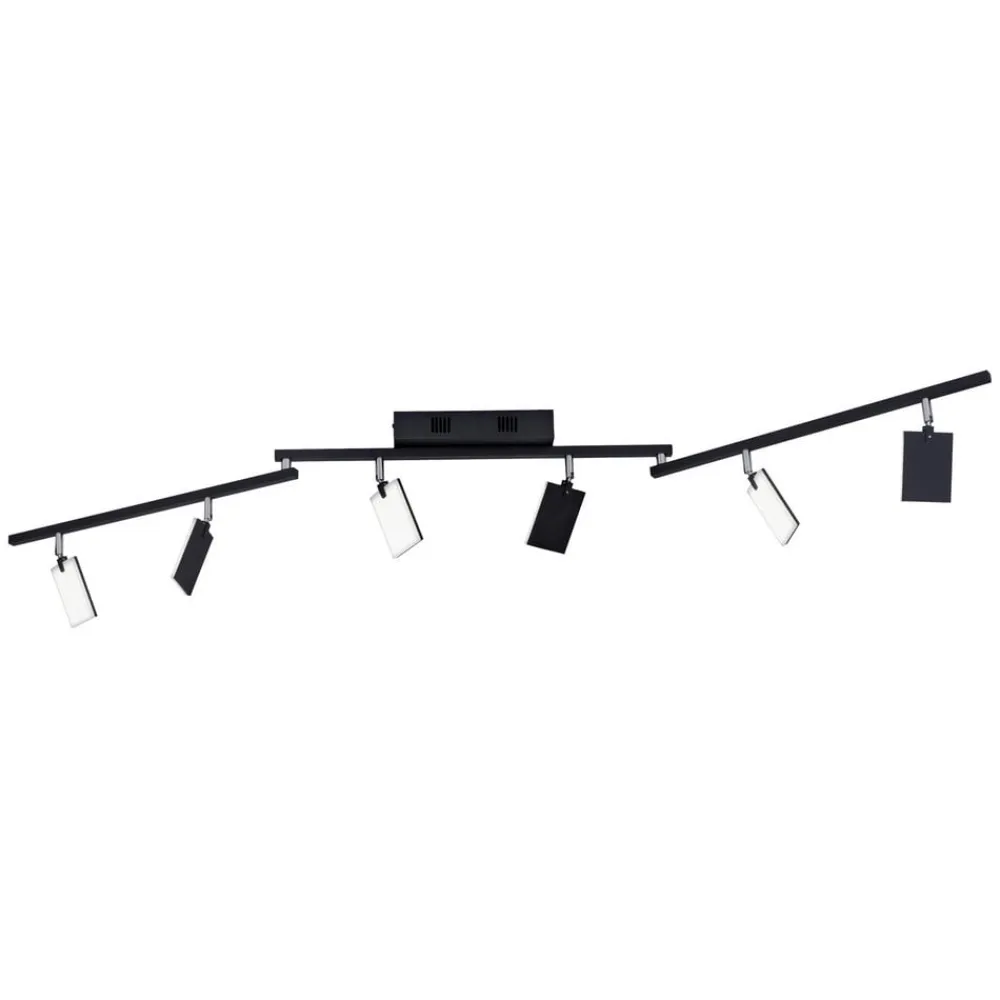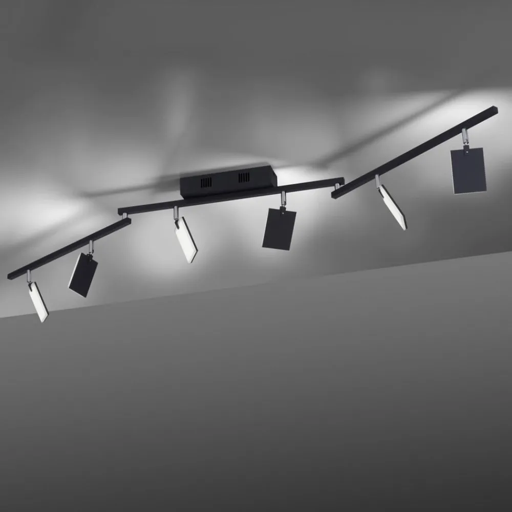 PURE Mira LED-loftslampe med seks justerbare lyselementer, lysstyrke og farvetemperatur kan justeres via fjernbetjening Med et åbent, minimalistisk design og en lang række muligheder for præcis justering, så den passer til forholdene i rummet, er Mira LED-loftslampen med seks lys det ideelle valg til omfattende rumbelysning i moderne miljøer. Aluminiumskonstruktionen består af en rektangulær loftskasse og tre arme, der er fastgjort i enderne ved hjælp af drejeled, som kan justeres på linje eller i en hvilken som helst vinkel i forhold til hinanden. Hver armsektion er udstyret med to rektangulære lyselementer monteret nedenunder, som igen kan drejes og svinges, så lyset fra LED-pladerne, der er installeret bag satinbelagte akryldæksler, kan rettes mod det ønskede område. Der medfølger en fjernbetjening til styring, som gør det muligt at dæmpe og justere farvetemperaturen, så Mira giver den rette belysning til ethvert miljø og tidspunkt på dagen. Efter tænding genaktiveres den sidst valgte indstilling (hukommelsesfunktion).