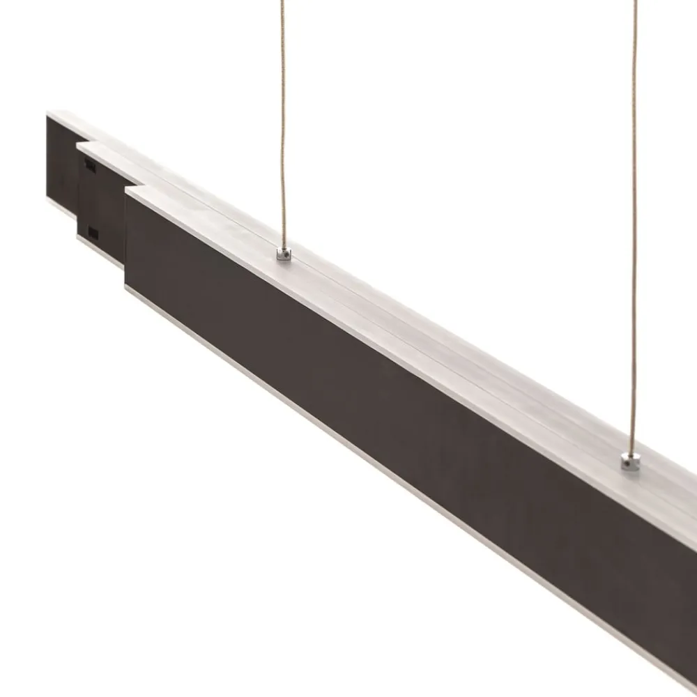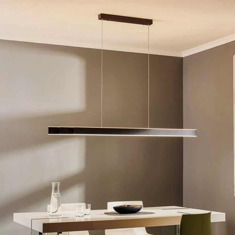Den lange og smalle LED-hængelampe PURE Lume med sit lige design passer ind i mange indretningsstilarter og tilbyder meget variabel belysning, da den både kan indstilles i tre trin med CCT-lysteknologi og er trinløst dæmpbar. Derudover kan lampens længde varieres, da skærmen, der består af tre smalle elementer, kan trækkes ud. Lysstyringen af det opad- og nedadrettede lys foregår via sensorer, der er integreret i toppen og bunden af lampen. Korte bevægelser i nærheden af sensorerne styrer lysfarven, og når man holder hånden under sensorerne, starter dæmpningsprocessen, som slutter, så snart hånden fjernes fra sensorområdet. Lysfarven kan indstilles i området fra varmhvid belysning til universalhvidt lys og er trinløst dæmpbar.