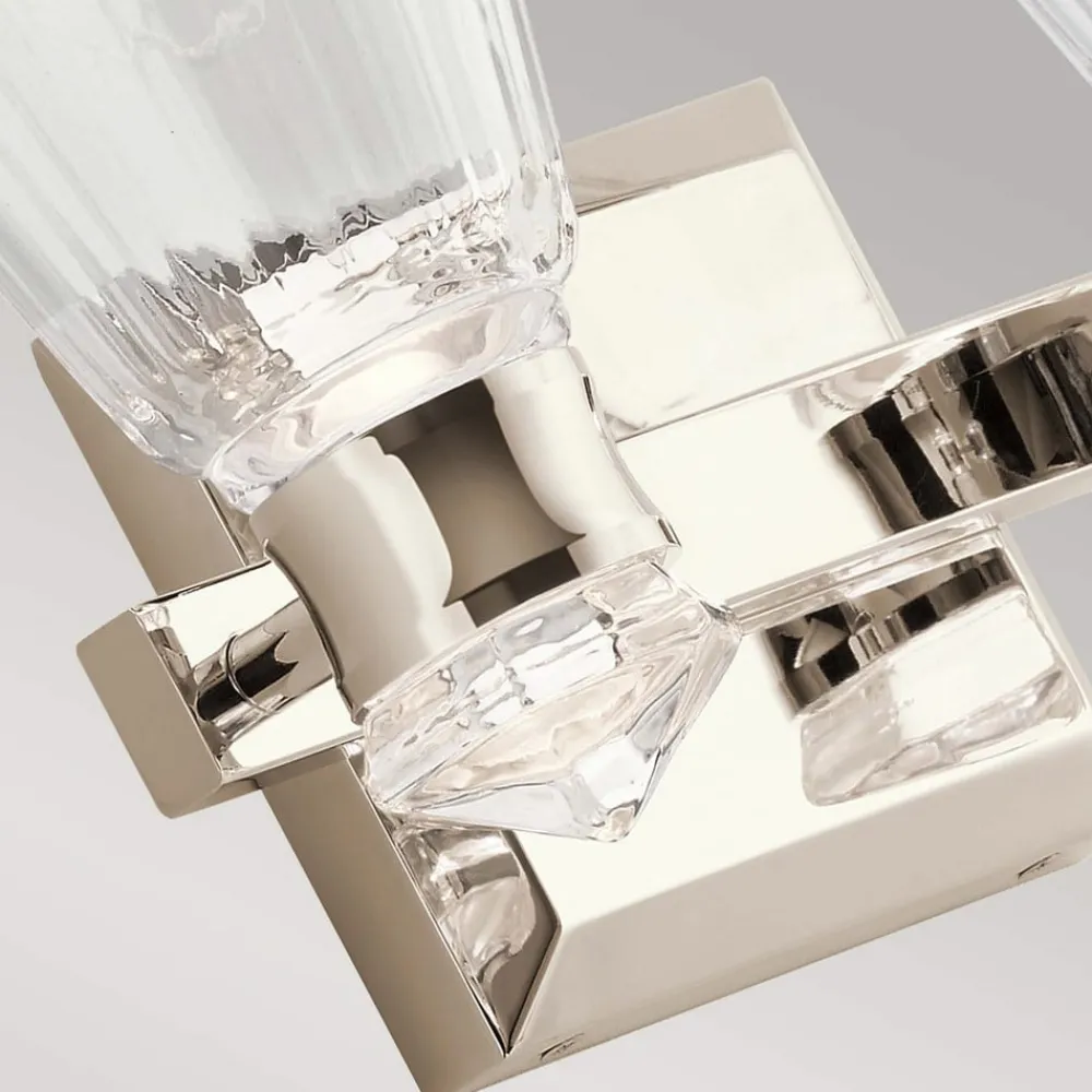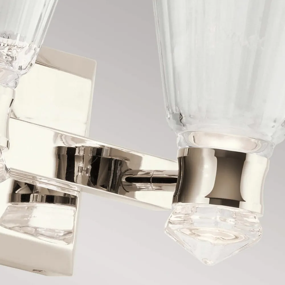 Kayva-væglampe med to lys og IP44-beskyttelse til badeværelser Inspireret af vintage glaskarafler fundet på parisiske loppemarkeder blev Kayva-serien skabt, som også er egnet til brug på badeværelset takket være sin IP44-beskyttelsesgrad. Lamperne i serien er udstyret med permanent installerede LED’er. De udstråler fransk elegance med deres kombination af slanke linjer, klart, facetteret glas og en poleret nikkelfinish på metallet. Den integrerede LED-teknologi sikrer energieffektiv belysning – eksternt dæmpbar