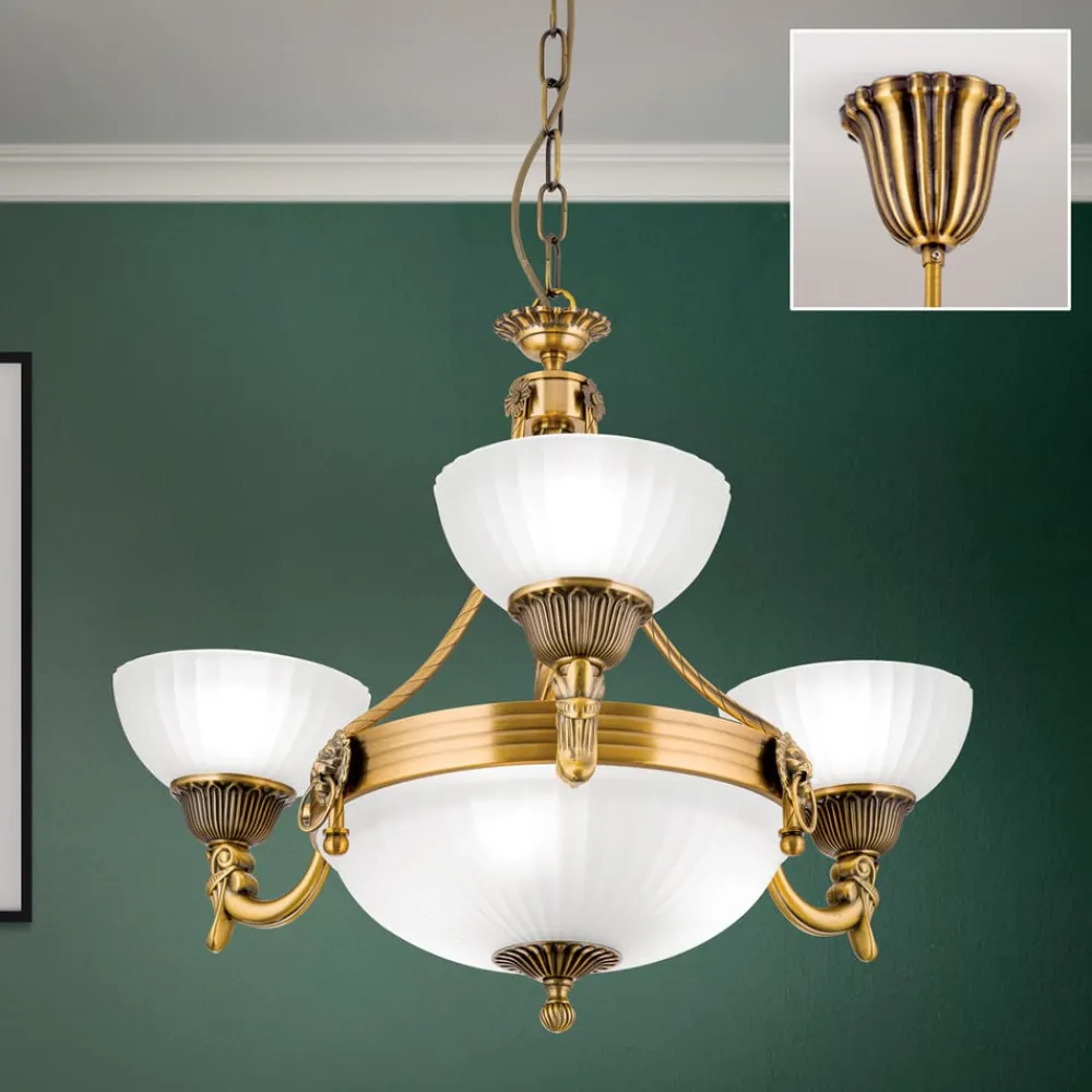 Detaljeret Rocca-lysekroneLysekronen Rocca har et klassisk look med en formfuldendt metalramme. Denne er holdt i bronzeoptik og suppleres af hvide glasskærme. Metalrammen har tiltalende detaljer, som især kommer til udtryk i lyset fra skærme. Rocca-lysekronen fremtryller indirekte lys nedad og direkte lys opad for at skabe en særlig atmosfære.