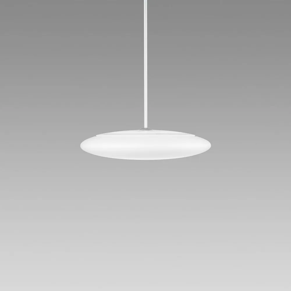 Skærmen på Torino LED-pendelarmaturet er fremstillet af opal plast og sikrer en blændfri lysfordeling. Torino er udstyret med tredimensionelle LED-tavler, der sikrer en særlig homogen belysning. Lyset udsendes både direkte (62 %) og indirekte (38 %), og skyggens elliptiske form sikrer en meget effektiv lysafgivelse. Pendlerøret er udstyret med et kugleled, som giver mulighed for selvnivellering på op til 20°.