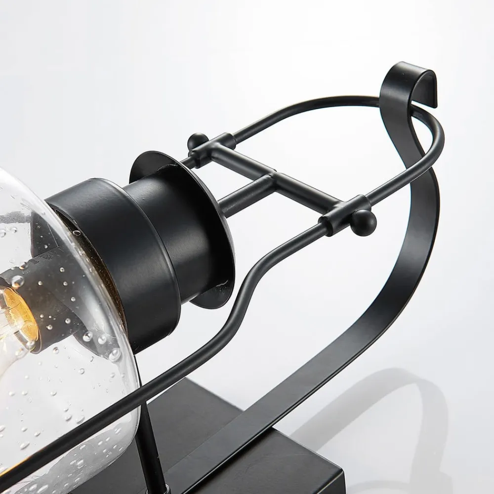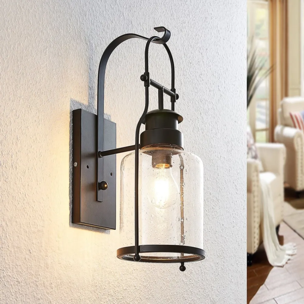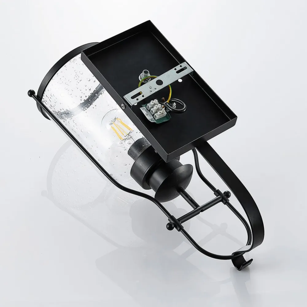 Nostalgisk design i sort metal og glas: væglampen Rozalie med lanterne-look Rozalie er uden tvivl noget ganske nostalgisk, og man kunne tro, at det er en lyskilde, der har eksisteret i årtier eller endda århundreder. Dengang blev disse lygter dog stadig drevet af stearinlys; i dag får elektricitet denne lyskilde til at skinne, ofte med stilfulde glødelamper eller rustikke lyspærer, der drives af energieffektiv LED-teknologi og stadig rummer udseendet af den gode gamle glødepære. Glasset er klart, men har også dekorative bobler, der påvirker både væglampens udseende og lyseffekt positivt.